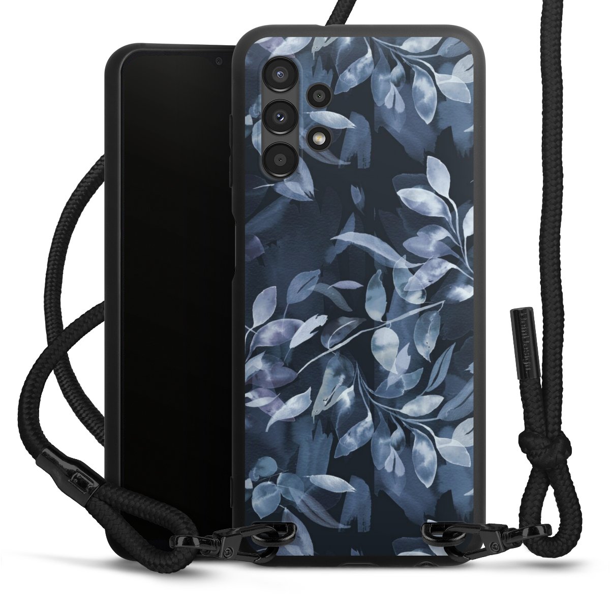 The matt black silicone case is made of flexible TPU (thermoplastic polyurethane) and offers robust protection. The durable, unbreakable material makes the cover flexible and dimensionally stable at the same time. The matte surface makes your design stand out more and is less susceptible to fingerprints and dirt. The stylish trend accessory fits comfortably in the hand and is perfectly complemented by the fabric (polyester) mobile phone strap. The braided fabric strap is approx. 1.70 metres long with a diameter of approx. 0.5 cm. Due to the special knotting technique, the length of the strap can be adjusted by simply pulling it, so that you can adapt it individually to your wishes. The practical case to wear around your neck is available with the fabric strap in black. As a little icing on the cake, we have provided the strap with a chic metal fastener in matt black. The strap is securely fastened to the case with loops made of high-quality genuine leather and press studs. The ends of the fabric strap are covered with metallic end caps and thus protected from fraying.