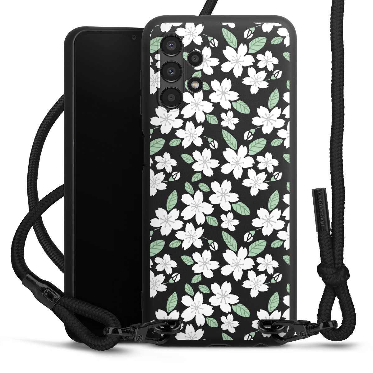 The matt black silicone case is made of flexible TPU (thermoplastic polyurethane) and offers robust protection. The durable, unbreakable material makes the cover flexible and dimensionally stable at the same time. The matte surface makes your design stand out more and is less susceptible to fingerprints and dirt. The stylish trend accessory fits comfortably in the hand and is perfectly complemented by the fabric (polyester) mobile phone strap. The braided fabric strap is approx. 1.70 metres long with a diameter of approx. 0.5 cm. Due to the special knotting technique, the length of the strap can be adjusted by simply pulling it, so that you can adapt it individually to your wishes. The practical case to wear around your neck is available with the fabric strap in black. As a little icing on the cake, we have provided the strap with a chic metal fastener in matt black. The strap is securely fastened to the case with loops made of high-quality genuine leather and press studs. The ends of the fabric strap are covered with metallic end caps and thus protected from fraying.