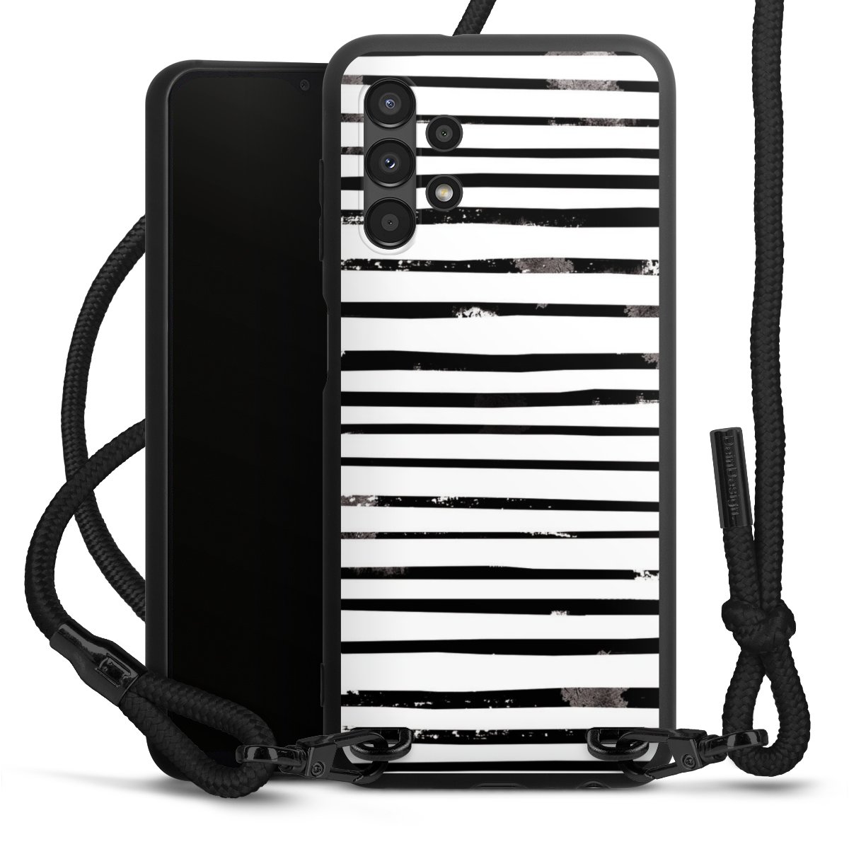 The matt black silicone case is made of flexible TPU (thermoplastic polyurethane) and offers robust protection. The durable, unbreakable material makes the cover flexible and dimensionally stable at the same time. The matte surface makes your design stand out more and is less susceptible to fingerprints and dirt. The stylish trend accessory fits comfortably in the hand and is perfectly complemented by the fabric (polyester) mobile phone strap. The braided fabric strap is approx. 1.70 metres long with a diameter of approx. 0.5 cm. Due to the special knotting technique, the length of the strap can be adjusted by simply pulling it, so that you can adapt it individually to your wishes. The practical case to wear around your neck is available with the fabric strap in black. As a little icing on the cake, we have provided the strap with a chic metal fastener in matt black. The strap is securely fastened to the case with loops made of high-quality genuine leather and press studs. The ends of the fabric strap are covered with metallic end caps and thus protected from fraying.