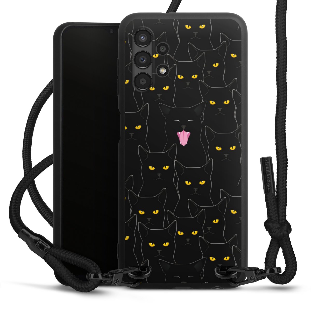 The matt black silicone case is made of flexible TPU (thermoplastic polyurethane) and offers robust protection. The durable, unbreakable material makes the cover flexible and dimensionally stable at the same time. The matte surface makes your design stand out more and is less susceptible to fingerprints and dirt. The stylish trend accessory fits comfortably in the hand and is perfectly complemented by the fabric (polyester) mobile phone strap. The braided fabric strap is approx. 1.70 metres long with a diameter of approx. 0.5 cm. Due to the special knotting technique, the length of the strap can be adjusted by simply pulling it, so that you can adapt it individually to your wishes. The practical case to wear around your neck is available with the fabric strap in black. As a little icing on the cake, we have provided the strap with a chic metal fastener in matt black. The strap is securely fastened to the case with loops made of high-quality genuine leather and press studs. The ends of the fabric strap are covered with metallic end caps and thus protected from fraying.