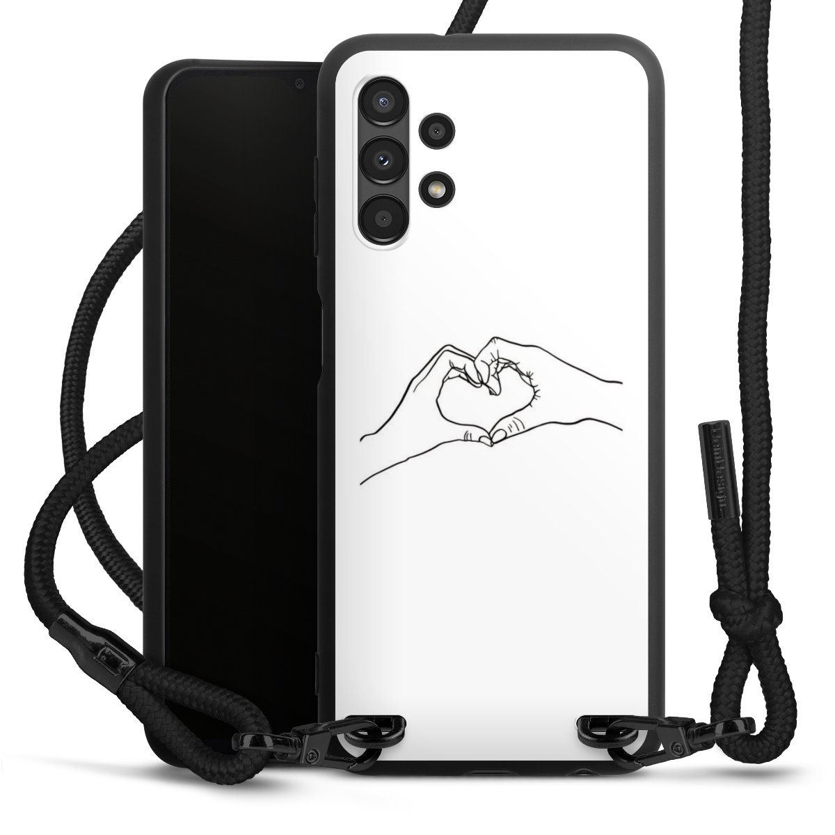 The matt black silicone case is made of flexible TPU (thermoplastic polyurethane) and offers robust protection. The durable, unbreakable material makes the cover flexible and dimensionally stable at the same time. The matte surface makes your design stand out more and is less susceptible to fingerprints and dirt. The stylish trend accessory fits comfortably in the hand and is perfectly complemented by the fabric (polyester) mobile phone strap. The braided fabric strap is approx. 1.70 metres long with a diameter of approx. 0.5 cm. Due to the special knotting technique, the length of the strap can be adjusted by simply pulling it, so that you can adapt it individually to your wishes. The practical case to wear around your neck is available with the fabric strap in black. As a little icing on the cake, we have provided the strap with a chic metal fastener in matt black. The strap is securely fastened to the case with loops made of high-quality genuine leather and press studs. The ends of the fabric strap are covered with metallic end caps and thus protected from fraying.