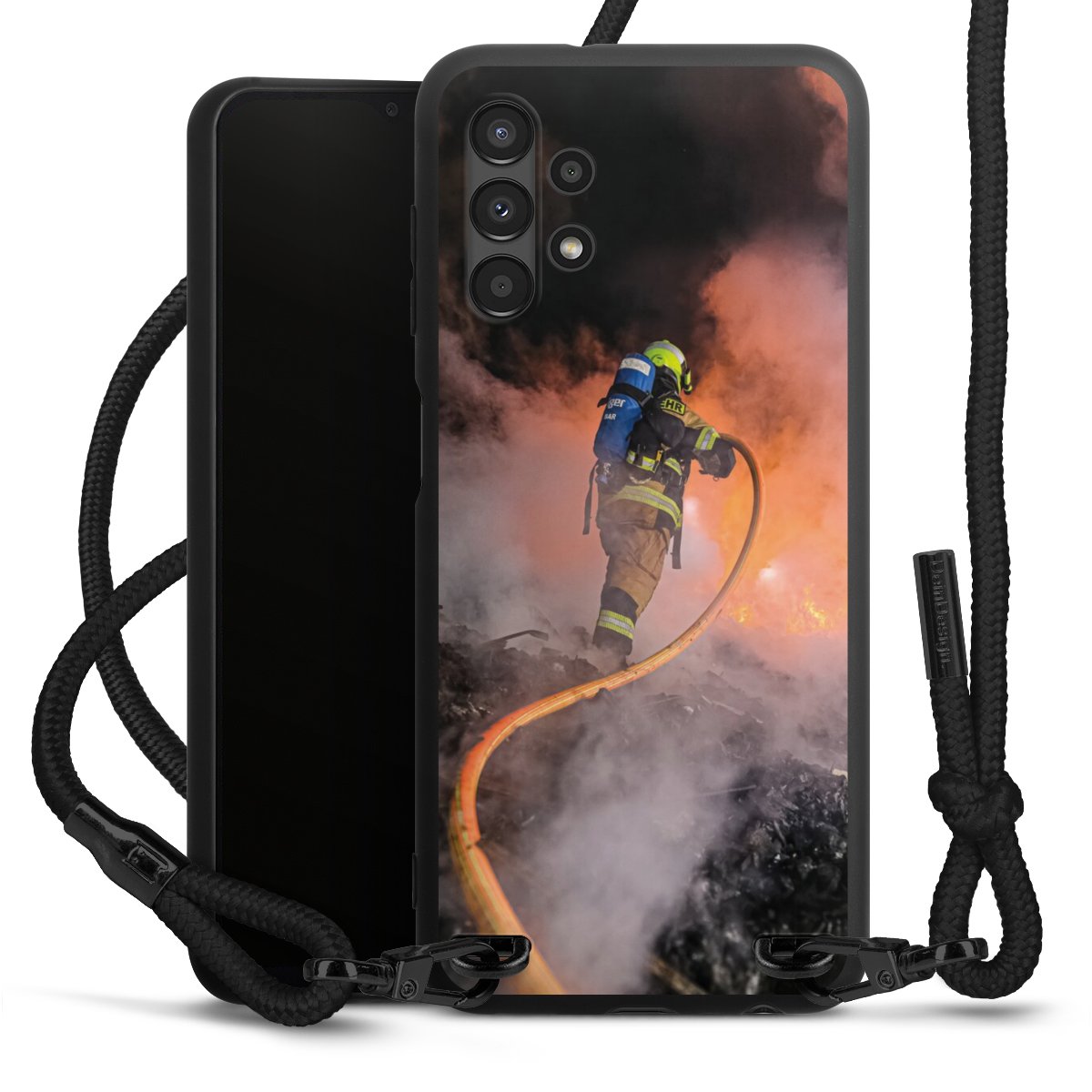 The matt black silicone case is made of flexible TPU (thermoplastic polyurethane) and offers robust protection. The durable, unbreakable material makes the cover flexible and dimensionally stable at the same time. The matte surface makes your design stand out more and is less susceptible to fingerprints and dirt. The stylish trend accessory fits comfortably in the hand and is perfectly complemented by the fabric (polyester) mobile phone strap. The braided fabric strap is approx. 1.70 metres long with a diameter of approx. 0.5 cm. Due to the special knotting technique, the length of the strap can be adjusted by simply pulling it, so that you can adapt it individually to your wishes. The practical case to wear around your neck is available with the fabric strap in black. As a little icing on the cake, we have provided the strap with a chic metal fastener in matt black. The strap is securely fastened to the case with loops made of high-quality genuine leather and press studs. The ends of the fabric strap are covered with metallic end caps and thus protected from fraying.