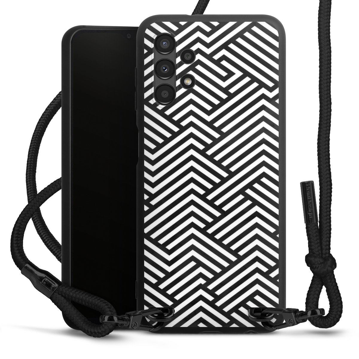 The matt black silicone case is made of flexible TPU (thermoplastic polyurethane) and offers robust protection. The durable, unbreakable material makes the cover flexible and dimensionally stable at the same time. The matte surface makes your design stand out more and is less susceptible to fingerprints and dirt. The stylish trend accessory fits comfortably in the hand and is perfectly complemented by the fabric (polyester) mobile phone strap. The braided fabric strap is approx. 1.70 metres long with a diameter of approx. 0.5 cm. Due to the special knotting technique, the length of the strap can be adjusted by simply pulling it, so that you can adapt it individually to your wishes. The practical case to wear around your neck is available with the fabric strap in black. As a little icing on the cake, we have provided the strap with a chic metal fastener in matt black. The strap is securely fastened to the case with loops made of high-quality genuine leather and press studs. The ends of the fabric strap are covered with metallic end caps and thus protected from fraying.