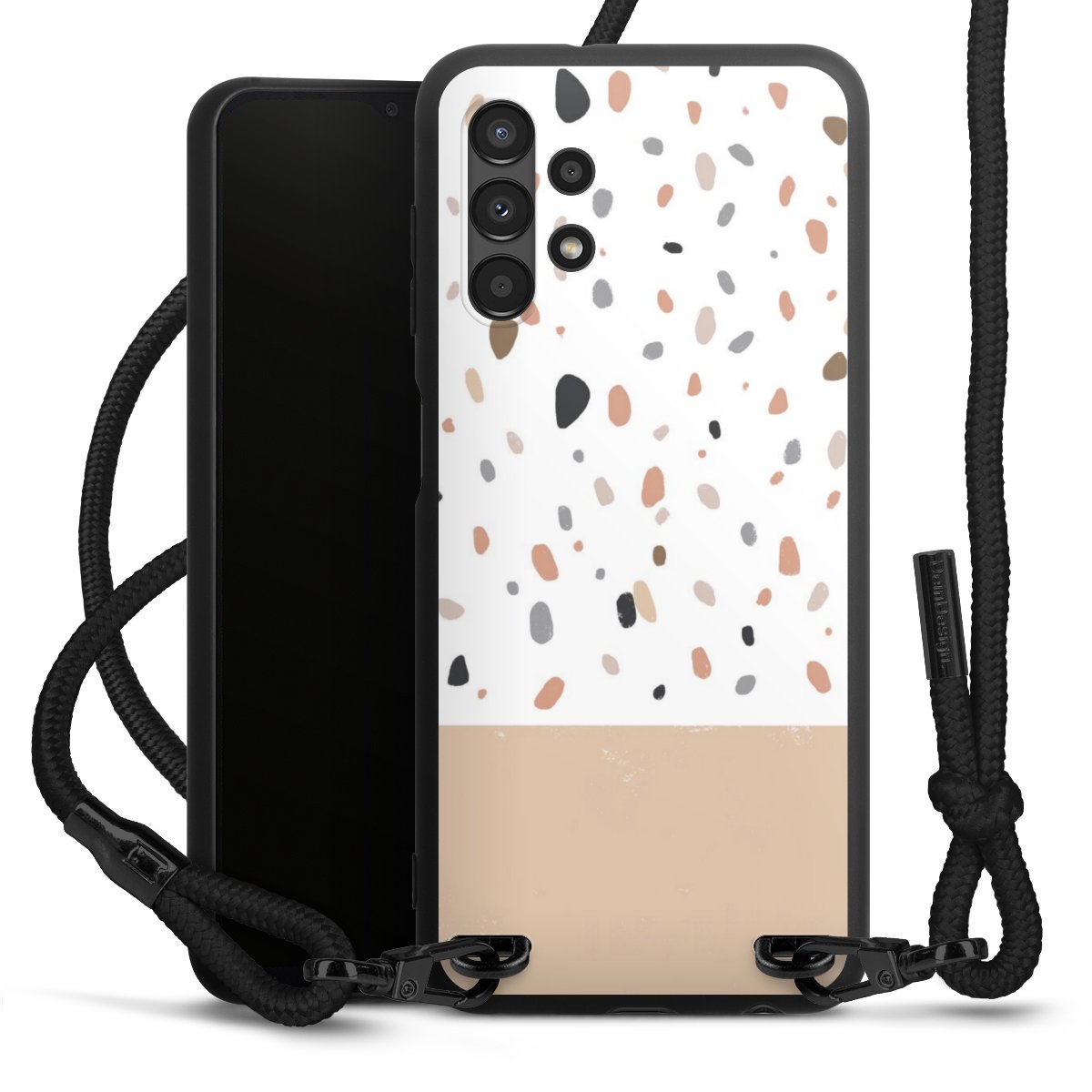 The matt black silicone case is made of flexible TPU (thermoplastic polyurethane) and offers robust protection. The durable, unbreakable material makes the cover flexible and dimensionally stable at the same time. The matte surface makes your design stand out more and is less susceptible to fingerprints and dirt. The stylish trend accessory fits comfortably in the hand and is perfectly complemented by the fabric (polyester) mobile phone strap. The braided fabric strap is approx. 1.70 metres long with a diameter of approx. 0.5 cm. Due to the special knotting technique, the length of the strap can be adjusted by simply pulling it, so that you can adapt it individually to your wishes. The practical case to wear around your neck is available with the fabric strap in black. As a little icing on the cake, we have provided the strap with a chic metal fastener in matt black. The strap is securely fastened to the case with loops made of high-quality genuine leather and press studs. The ends of the fabric strap are covered with metallic end caps and thus protected from fraying.
