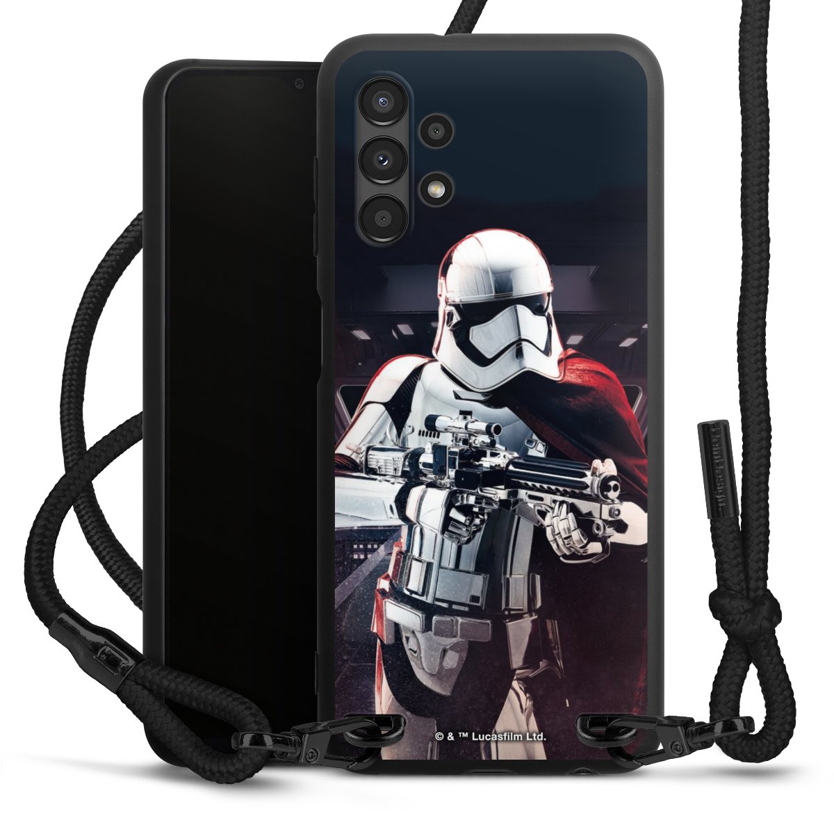 The matt black silicone case is made of flexible TPU (thermoplastic polyurethane) and offers robust protection. The durable, unbreakable material makes the cover flexible and dimensionally stable at the same time. The matte surface makes your design stand out more and is less susceptible to fingerprints and dirt. The stylish trend accessory fits comfortably in the hand and is perfectly complemented by the fabric (polyester) mobile phone strap. The braided fabric strap is approx. 1.70 metres long with a diameter of approx. 0.5 cm. Due to the special knotting technique, the length of the strap can be adjusted by simply pulling it, so that you can adapt it individually to your wishes. The practical case to wear around your neck is available with the fabric strap in black. As a little icing on the cake, we have provided the strap with a chic metal fastener in matt black. The strap is securely fastened to the case with loops made of high-quality genuine leather and press studs. The ends of the fabric strap are covered with metallic end caps and thus protected from fraying.
