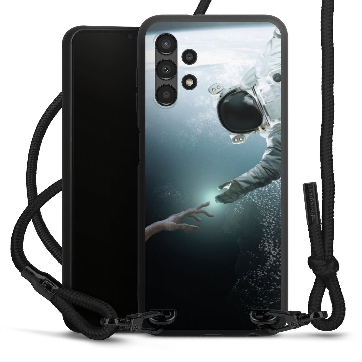 The matt black silicone case is made of flexible TPU (thermoplastic polyurethane) and offers robust protection. The durable, unbreakable material makes the cover flexible and dimensionally stable at the same time. The matte surface makes your design stand out more and is less susceptible to fingerprints and dirt. The stylish trend accessory fits comfortably in the hand and is perfectly complemented by the fabric (polyester) mobile phone strap. The braided fabric strap is approx. 1.70 metres long with a diameter of approx. 0.5 cm. Due to the special knotting technique, the length of the strap can be adjusted by simply pulling it, so that you can adapt it individually to your wishes. The practical case to wear around your neck is available with the fabric strap in black. As a little icing on the cake, we have provided the strap with a chic metal fastener in matt black. The strap is securely fastened to the case with loops made of high-quality genuine leather and press studs. The ends of the fabric strap are covered with metallic end caps and thus protected from fraying.
