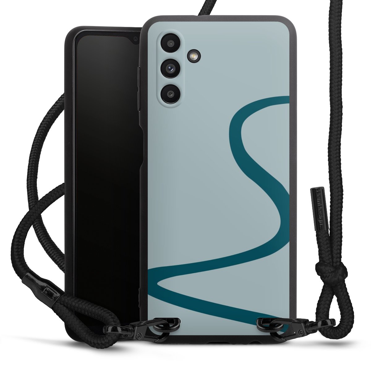 The matt black silicone case is made of flexible TPU (thermoplastic polyurethane) and offers robust protection. The durable, unbreakable material makes the cover flexible and dimensionally stable at the same time. The matte surface makes your design stand out more and is less susceptible to fingerprints and dirt. The stylish trend accessory fits comfortably in the hand and is perfectly complemented by the fabric (polyester) mobile phone strap. The braided fabric strap is approx. 1.70 metres long with a diameter of approx. 0.5 cm. Due to the special knotting technique, the length of the strap can be adjusted by simply pulling it, so that you can adapt it individually to your wishes. The practical case to wear around your neck is available with the fabric strap in black. As a little icing on the cake, we have provided the strap with a chic metal fastener in matt black. The strap is securely fastened to the case with loops made of high-quality genuine leather and press studs. The ends of the fabric strap are covered with metallic end caps and thus protected from fraying.