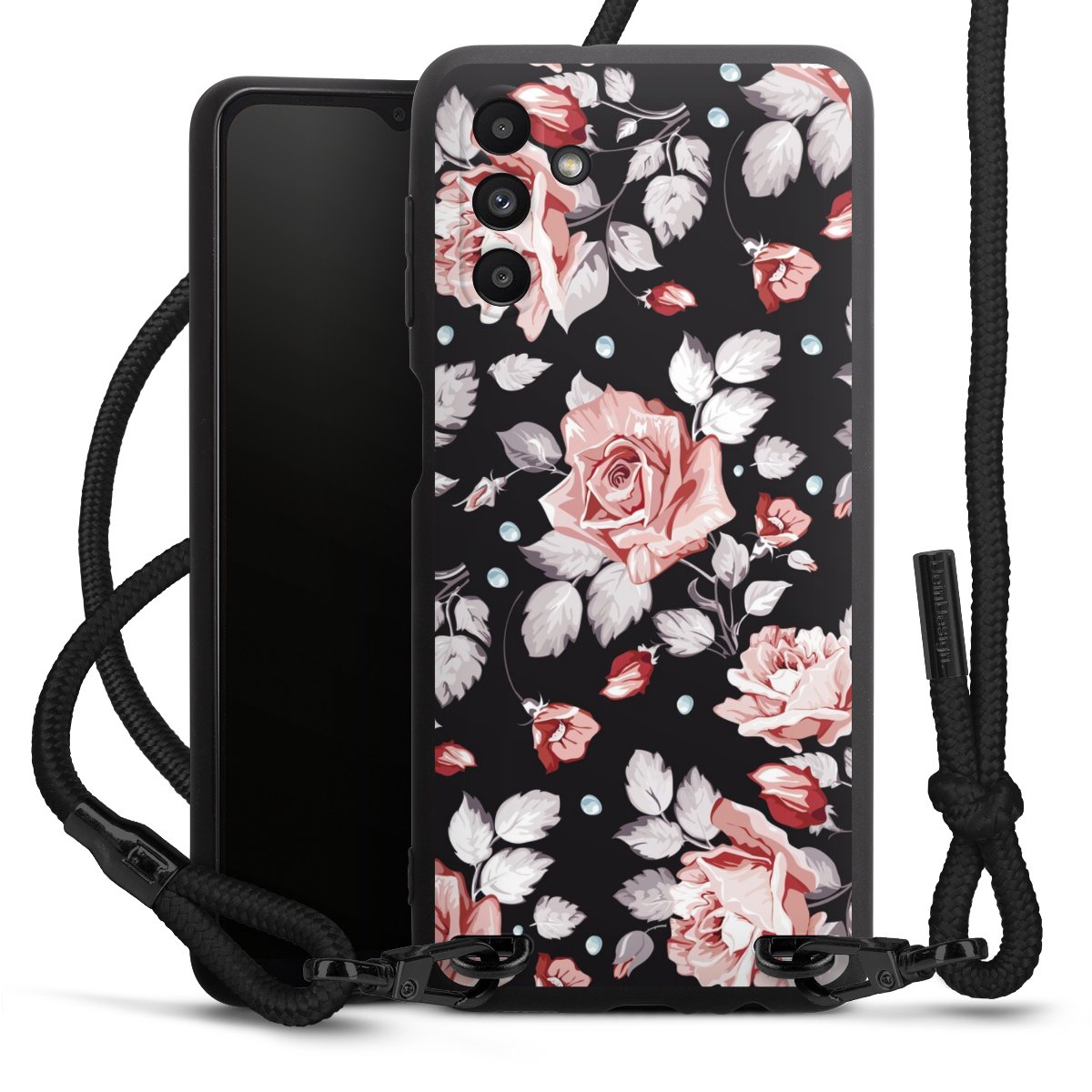 The matt black silicone case is made of flexible TPU (thermoplastic polyurethane) and offers robust protection. The durable, unbreakable material makes the cover flexible and dimensionally stable at the same time. The matte surface makes your design stand out more and is less susceptible to fingerprints and dirt. The stylish trend accessory fits comfortably in the hand and is perfectly complemented by the fabric (polyester) mobile phone strap. The braided fabric strap is approx. 1.70 metres long with a diameter of approx. 0.5 cm. Due to the special knotting technique, the length of the strap can be adjusted by simply pulling it, so that you can adapt it individually to your wishes. The practical case to wear around your neck is available with the fabric strap in black. As a little icing on the cake, we have provided the strap with a chic metal fastener in matt black. The strap is securely fastened to the case with loops made of high-quality genuine leather and press studs. The ends of the fabric strap are covered with metallic end caps and thus protected from fraying.