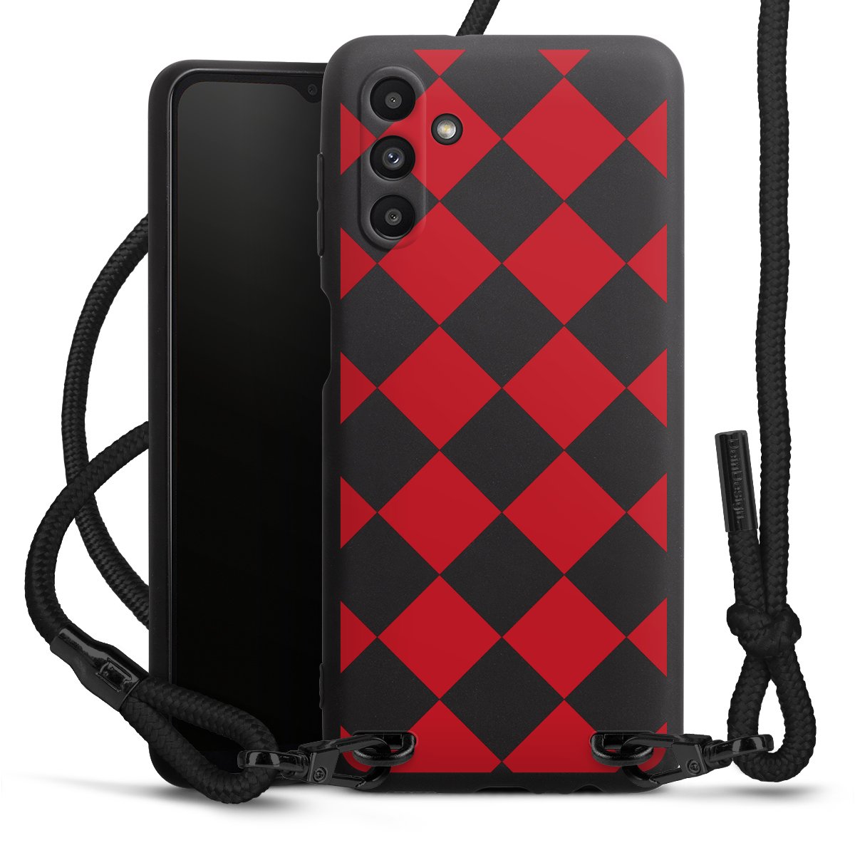 The matt black silicone case is made of flexible TPU (thermoplastic polyurethane) and offers robust protection. The durable, unbreakable material makes the cover flexible and dimensionally stable at the same time. The matte surface makes your design stand out more and is less susceptible to fingerprints and dirt. The stylish trend accessory fits comfortably in the hand and is perfectly complemented by the fabric (polyester) mobile phone strap. The braided fabric strap is approx. 1.70 metres long with a diameter of approx. 0.5 cm. Due to the special knotting technique, the length of the strap can be adjusted by simply pulling it, so that you can adapt it individually to your wishes. The practical case to wear around your neck is available with the fabric strap in black. As a little icing on the cake, we have provided the strap with a chic metal fastener in matt black. The strap is securely fastened to the case with loops made of high-quality genuine leather and press studs. The ends of the fabric strap are covered with metallic end caps and thus protected from fraying.