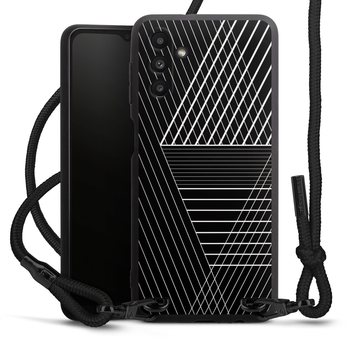 The matt black silicone case is made of flexible TPU (thermoplastic polyurethane) and offers robust protection. The durable, unbreakable material makes the cover flexible and dimensionally stable at the same time. The matte surface makes your design stand out more and is less susceptible to fingerprints and dirt. The stylish trend accessory fits comfortably in the hand and is perfectly complemented by the fabric (polyester) mobile phone strap. The braided fabric strap is approx. 1.70 metres long with a diameter of approx. 0.5 cm. Due to the special knotting technique, the length of the strap can be adjusted by simply pulling it, so that you can adapt it individually to your wishes. The practical case to wear around your neck is available with the fabric strap in black. As a little icing on the cake, we have provided the strap with a chic metal fastener in matt black. The strap is securely fastened to the case with loops made of high-quality genuine leather and press studs. The ends of the fabric strap are covered with metallic end caps and thus protected from fraying.
