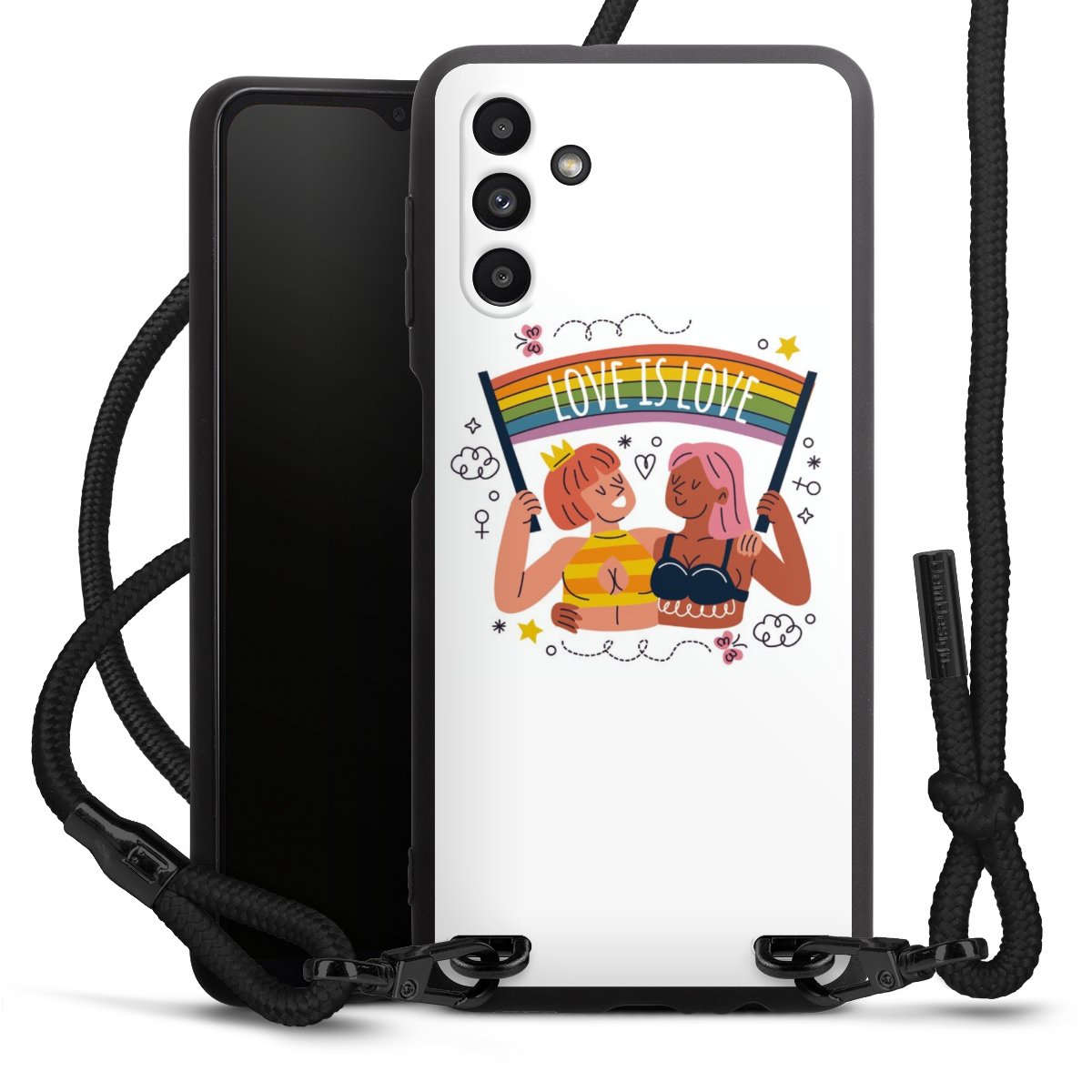 We use the solid direct print process for this phone case, which is why the print area only covers the back and the edge remains unprinted. The case to wear around your neck can be ordered unprinted, fully printed, or partially printed. For your design, either choose one of our exclusive shop motifs or get creative and create your own design, for example with photos and overlays. Design your own personal trend accessory and make an individual statement on the streets!