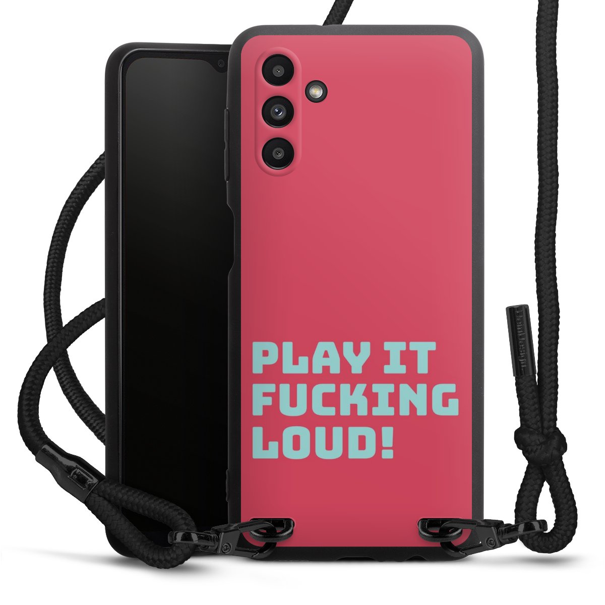 The matt black silicone case is made of flexible TPU (thermoplastic polyurethane) and offers robust protection. The durable, unbreakable material makes the cover flexible and dimensionally stable at the same time. The matte surface makes your design stand out more and is less susceptible to fingerprints and dirt. The stylish trend accessory fits comfortably in the hand and is perfectly complemented by the fabric (polyester) mobile phone strap. The braided fabric strap is approx. 1.70 metres long with a diameter of approx. 0.5 cm. Due to the special knotting technique, the length of the strap can be adjusted by simply pulling it, so that you can adapt it individually to your wishes. The practical case to wear around your neck is available with the fabric strap in black. As a little icing on the cake, we have provided the strap with a chic metal fastener in matt black. The strap is securely fastened to the case with loops made of high-quality genuine leather and press studs. The ends of the fabric strap are covered with metallic end caps and thus protected from fraying.
