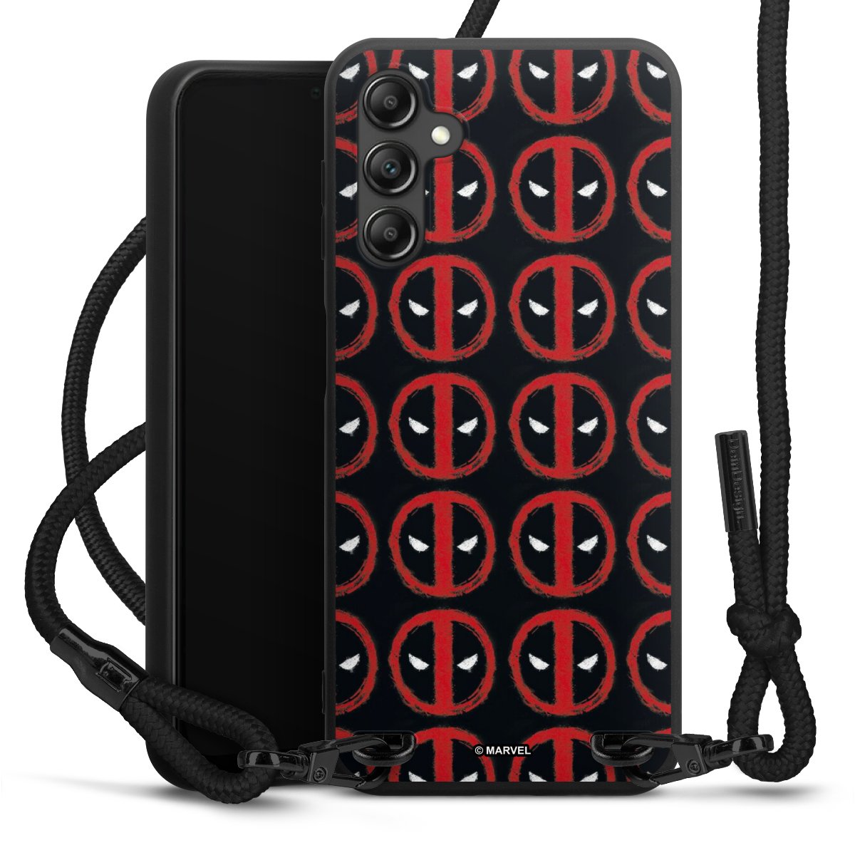 The matt black silicone case is made of flexible TPU (thermoplastic polyurethane) and offers robust protection. The durable, unbreakable material makes the cover flexible and dimensionally stable at the same time. The matte surface makes your design stand out more and is less susceptible to fingerprints and dirt. The stylish trend accessory fits comfortably in the hand and is perfectly complemented by the fabric (polyester) mobile phone strap. The braided fabric strap is approx. 1.70 metres long with a diameter of approx. 0.5 cm. Due to the special knotting technique, the length of the strap can be adjusted by simply pulling it, so that you can adapt it individually to your wishes. The practical case to wear around your neck is available with the fabric strap in black. As a little icing on the cake, we have provided the strap with a chic metal fastener in matt black. The strap is securely fastened to the case with loops made of high-quality genuine leather and press studs. The ends of the fabric strap are covered with metallic end caps and thus protected from fraying.