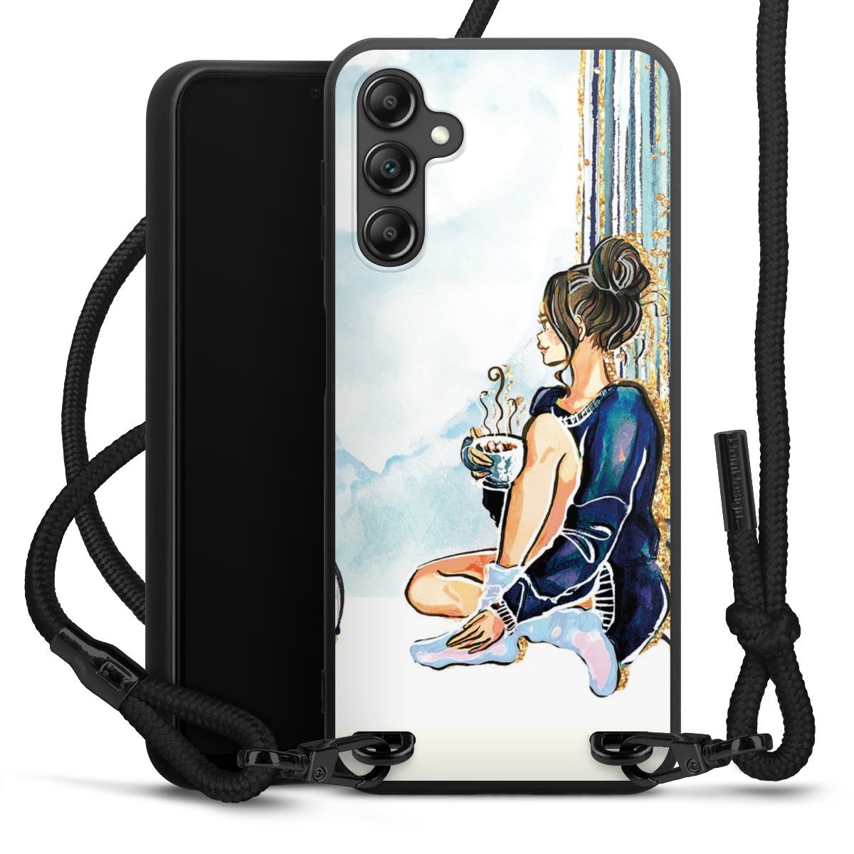 The matt black silicone case is made of flexible TPU (thermoplastic polyurethane) and offers robust protection. The durable, unbreakable material makes the cover flexible and dimensionally stable at the same time. The matte surface makes your design stand out more and is less susceptible to fingerprints and dirt. The stylish trend accessory fits comfortably in the hand and is perfectly complemented by the fabric (polyester) mobile phone strap. The braided fabric strap is approx. 1.70 metres long with a diameter of approx. 0.5 cm. Due to the special knotting technique, the length of the strap can be adjusted by simply pulling it, so that you can adapt it individually to your wishes. The practical case to wear around your neck is available with the fabric strap in black. As a little icing on the cake, we have provided the strap with a chic metal fastener in matt black. The strap is securely fastened to the case with loops made of high-quality genuine leather and press studs. The ends of the fabric strap are covered with metallic end caps and thus protected from fraying.