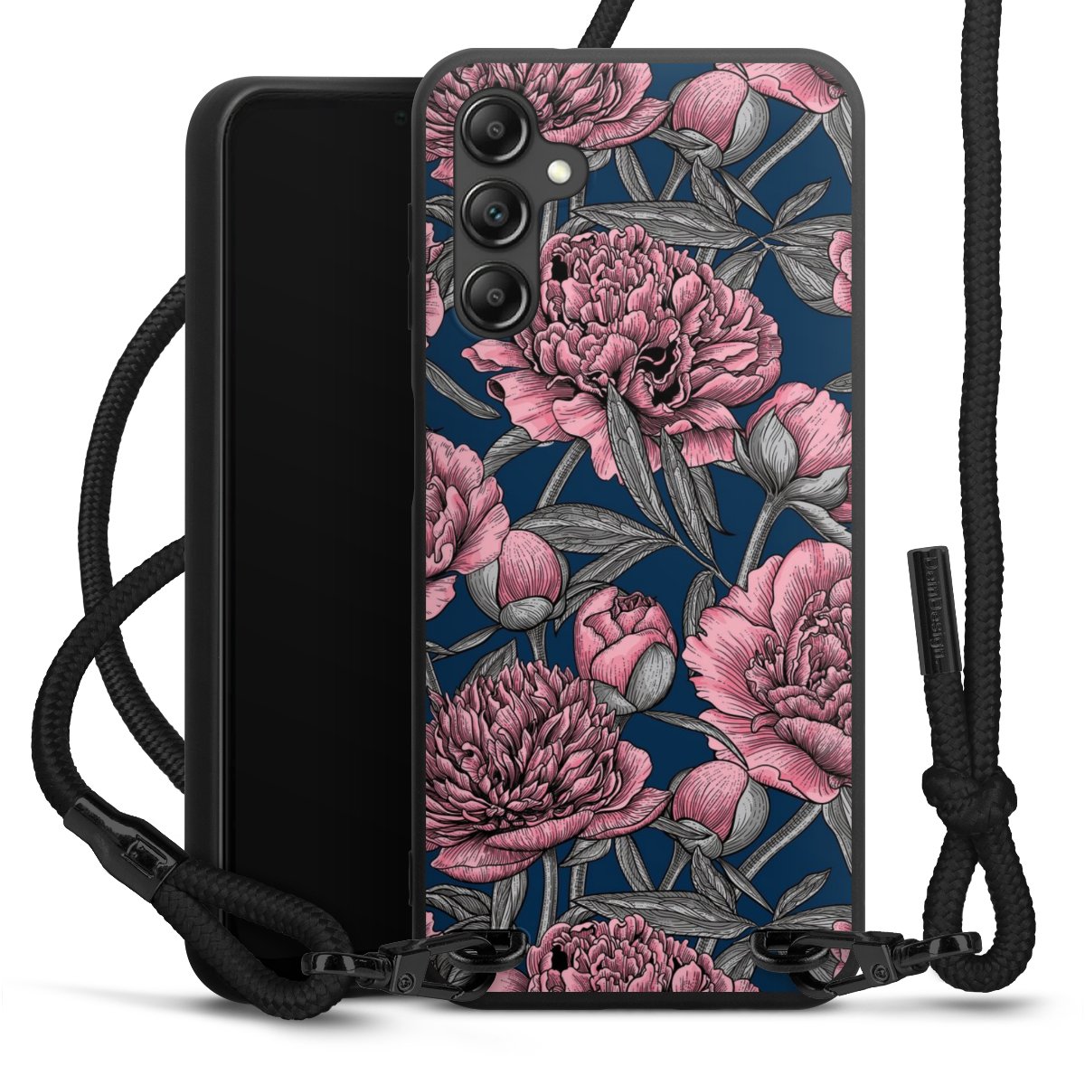 The matt black silicone case is made of flexible TPU (thermoplastic polyurethane) and offers robust protection. The durable, unbreakable material makes the cover flexible and dimensionally stable at the same time. The matte surface makes your design stand out more and is less susceptible to fingerprints and dirt. The stylish trend accessory fits comfortably in the hand and is perfectly complemented by the fabric (polyester) mobile phone strap. The braided fabric strap is approx. 1.70 metres long with a diameter of approx. 0.5 cm. Due to the special knotting technique, the length of the strap can be adjusted by simply pulling it, so that you can adapt it individually to your wishes. The practical case to wear around your neck is available with the fabric strap in black. As a little icing on the cake, we have provided the strap with a chic metal fastener in matt black. The strap is securely fastened to the case with loops made of high-quality genuine leather and press studs. The ends of the fabric strap are covered with metallic end caps and thus protected from fraying.