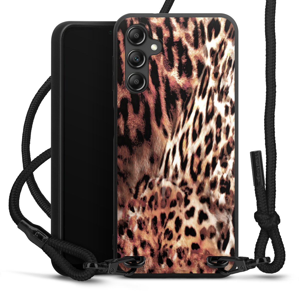 The matt black silicone case is made of flexible TPU (thermoplastic polyurethane) and offers robust protection. The durable, unbreakable material makes the cover flexible and dimensionally stable at the same time. The matte surface makes your design stand out more and is less susceptible to fingerprints and dirt. The stylish trend accessory fits comfortably in the hand and is perfectly complemented by the fabric (polyester) mobile phone strap. The braided fabric strap is approx. 1.70 metres long with a diameter of approx. 0.5 cm. Due to the special knotting technique, the length of the strap can be adjusted by simply pulling it, so that you can adapt it individually to your wishes. The practical case to wear around your neck is available with the fabric strap in black. As a little icing on the cake, we have provided the strap with a chic metal fastener in matt black. The strap is securely fastened to the case with loops made of high-quality genuine leather and press studs. The ends of the fabric strap are covered with metallic end caps and thus protected from fraying.
