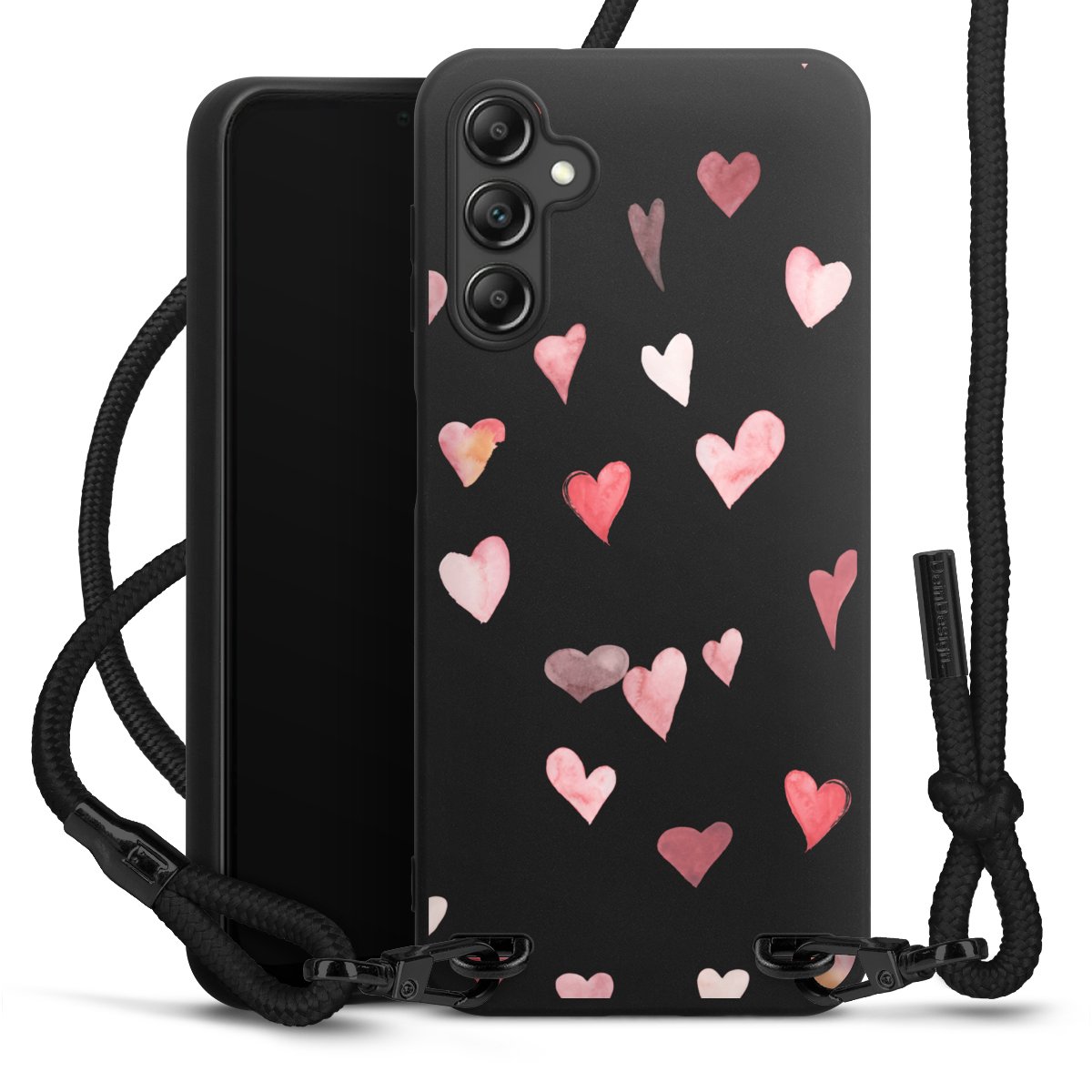 The matt black silicone case is made of flexible TPU (thermoplastic polyurethane) and offers robust protection. The durable, unbreakable material makes the cover flexible and dimensionally stable at the same time. The matte surface makes your design stand out more and is less susceptible to fingerprints and dirt. The stylish trend accessory fits comfortably in the hand and is perfectly complemented by the fabric (polyester) mobile phone strap. The braided fabric strap is approx. 1.70 metres long with a diameter of approx. 0.5 cm. Due to the special knotting technique, the length of the strap can be adjusted by simply pulling it, so that you can adapt it individually to your wishes. The practical case to wear around your neck is available with the fabric strap in black. As a little icing on the cake, we have provided the strap with a chic metal fastener in matt black. The strap is securely fastened to the case with loops made of high-quality genuine leather and press studs. The ends of the fabric strap are covered with metallic end caps and thus protected from fraying.