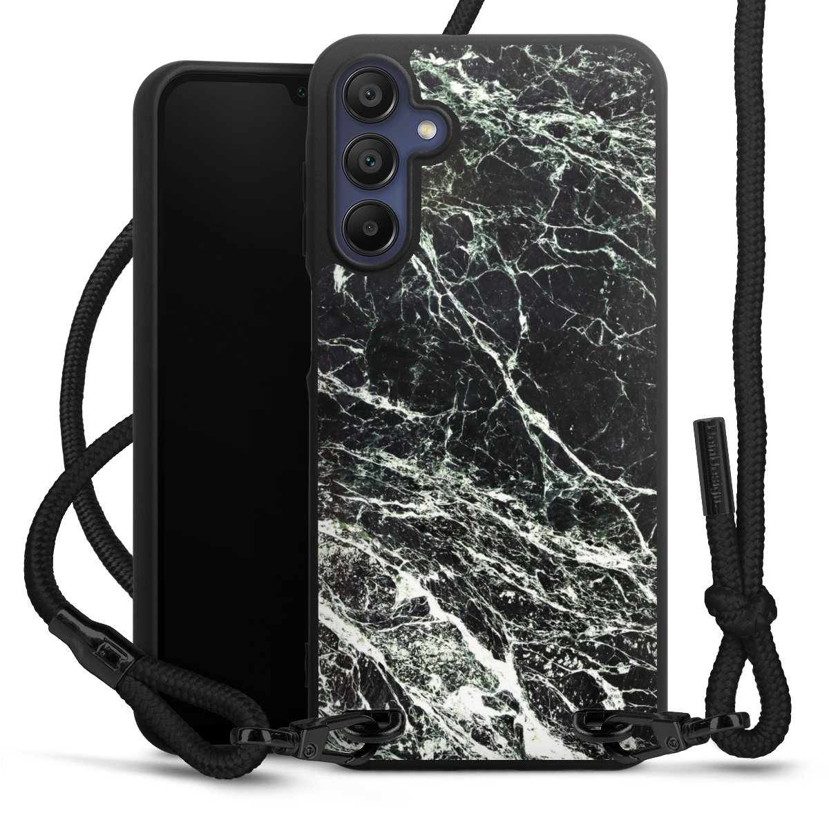 The matt black silicone case is made of flexible TPU (thermoplastic polyurethane) and offers robust protection. The durable, unbreakable material makes the cover flexible and dimensionally stable at the same time. The matte surface makes your design stand out more and is less susceptible to fingerprints and dirt. The stylish trend accessory fits comfortably in the hand and is perfectly complemented by the fabric (polyester) mobile phone strap. The braided fabric strap is approx. 1.70 metres long with a diameter of approx. 0.5 cm. Due to the special knotting technique, the length of the strap can be adjusted by simply pulling it, so that you can adapt it individually to your wishes. The practical case to wear around your neck is available with the fabric strap in black. As a little icing on the cake, we have provided the strap with a chic metal fastener in matt black. The strap is securely fastened to the case with loops made of high-quality genuine leather and press studs. The ends of the fabric strap are covered with metallic end caps and thus protected from fraying.