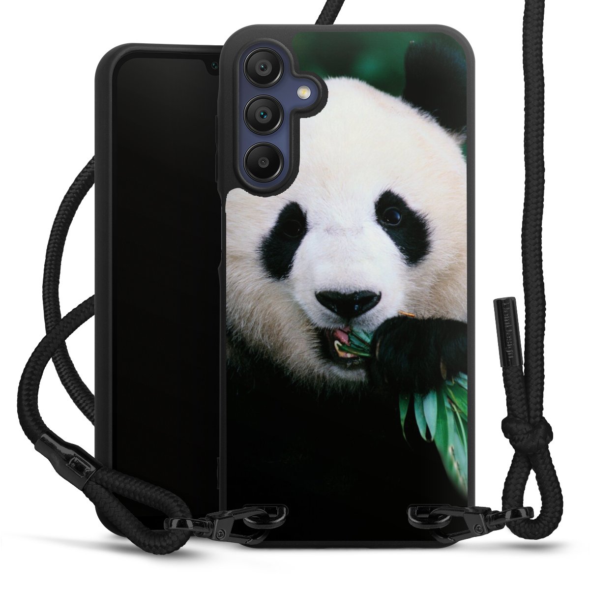 The matt black silicone case is made of flexible TPU (thermoplastic polyurethane) and offers robust protection. The durable, unbreakable material makes the cover flexible and dimensionally stable at the same time. The matte surface makes your design stand out more and is less susceptible to fingerprints and dirt. The stylish trend accessory fits comfortably in the hand and is perfectly complemented by the fabric (polyester) mobile phone strap. The braided fabric strap is approx. 1.70 metres long with a diameter of approx. 0.5 cm. Due to the special knotting technique, the length of the strap can be adjusted by simply pulling it, so that you can adapt it individually to your wishes. The practical case to wear around your neck is available with the fabric strap in black. As a little icing on the cake, we have provided the strap with a chic metal fastener in matt black. The strap is securely fastened to the case with loops made of high-quality genuine leather and press studs. The ends of the fabric strap are covered with metallic end caps and thus protected from fraying.
