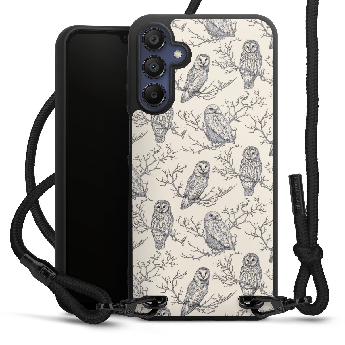The matt black silicone case is made of flexible TPU (thermoplastic polyurethane) and offers robust protection. The durable, unbreakable material makes the cover flexible and dimensionally stable at the same time. The matte surface makes your design stand out more and is less susceptible to fingerprints and dirt. The stylish trend accessory fits comfortably in the hand and is perfectly complemented by the fabric (polyester) mobile phone strap. The braided fabric strap is approx. 1.70 metres long with a diameter of approx. 0.5 cm. Due to the special knotting technique, the length of the strap can be adjusted by simply pulling it, so that you can adapt it individually to your wishes. The practical case to wear around your neck is available with the fabric strap in black. As a little icing on the cake, we have provided the strap with a chic metal fastener in matt black. The strap is securely fastened to the case with loops made of high-quality genuine leather and press studs. The ends of the fabric strap are covered with metallic end caps and thus protected from fraying.