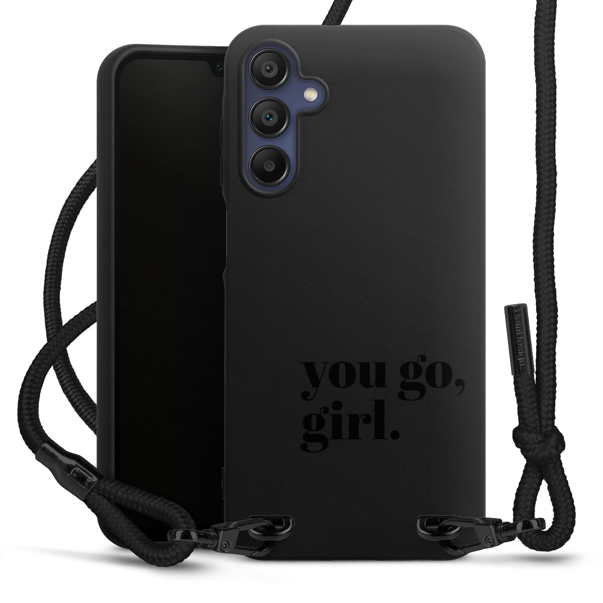 The matt black silicone case is made of flexible TPU (thermoplastic polyurethane) and offers robust protection. The durable, unbreakable material makes the cover flexible and dimensionally stable at the same time. The matte surface makes your design stand out more and is less susceptible to fingerprints and dirt. The stylish trend accessory fits comfortably in the hand and is perfectly complemented by the fabric (polyester) mobile phone strap. The braided fabric strap is approx. 1.70 metres long with a diameter of approx. 0.5 cm. Due to the special knotting technique, the length of the strap can be adjusted by simply pulling it, so that you can adapt it individually to your wishes. The practical case to wear around your neck is available with the fabric strap in black. As a little icing on the cake, we have provided the strap with a chic metal fastener in matt black. The strap is securely fastened to the case with loops made of high-quality genuine leather and press studs. The ends of the fabric strap are covered with metallic end caps and thus protected from fraying.
