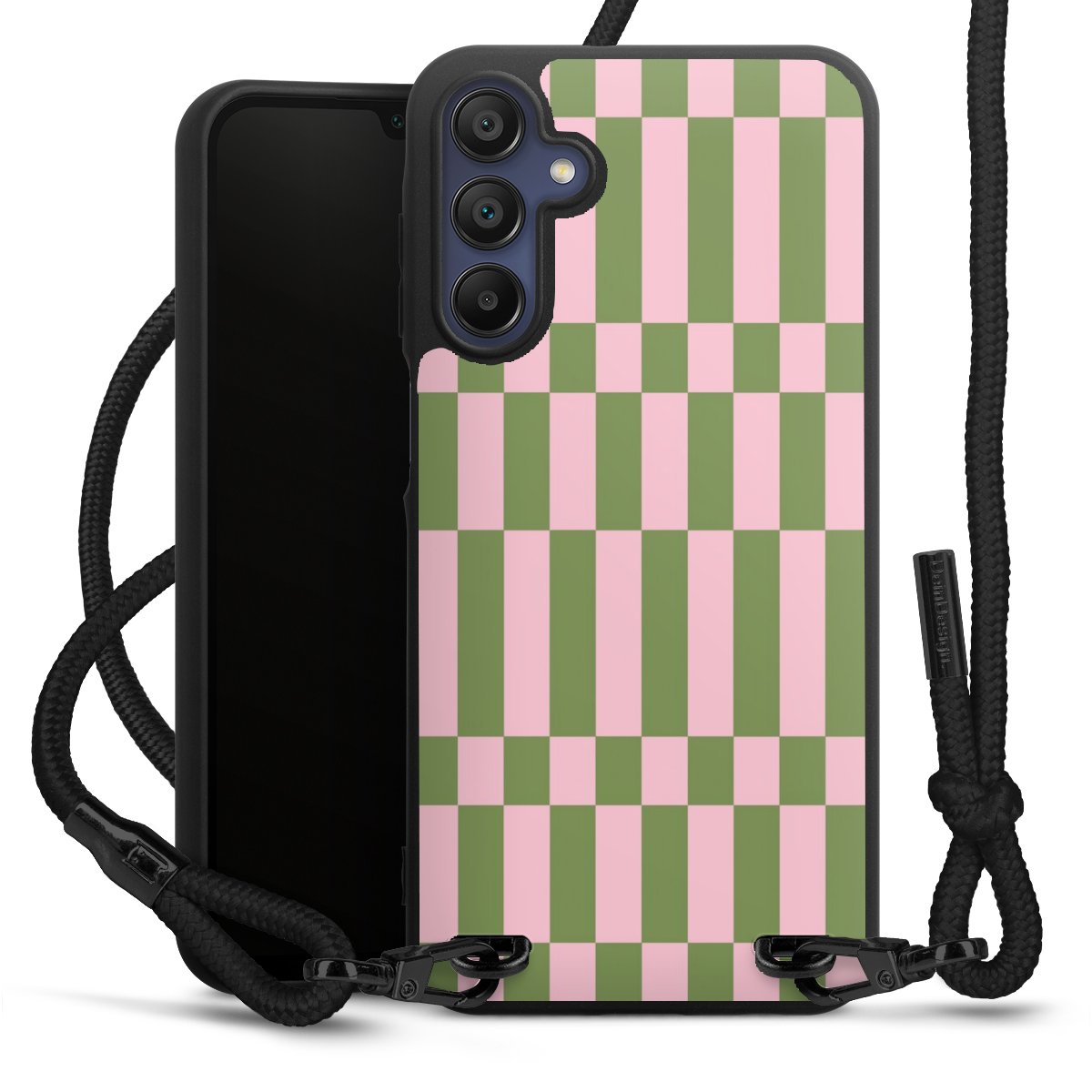 The matt black silicone case is made of flexible TPU (thermoplastic polyurethane) and offers robust protection. The durable, unbreakable material makes the cover flexible and dimensionally stable at the same time. The matte surface makes your design stand out more and is less susceptible to fingerprints and dirt. The stylish trend accessory fits comfortably in the hand and is perfectly complemented by the fabric (polyester) mobile phone strap. The braided fabric strap is approx. 1.70 metres long with a diameter of approx. 0.5 cm. Due to the special knotting technique, the length of the strap can be adjusted by simply pulling it, so that you can adapt it individually to your wishes. The practical case to wear around your neck is available with the fabric strap in black. As a little icing on the cake, we have provided the strap with a chic metal fastener in matt black. The strap is securely fastened to the case with loops made of high-quality genuine leather and press studs. The ends of the fabric strap are covered with metallic end caps and thus protected from fraying.