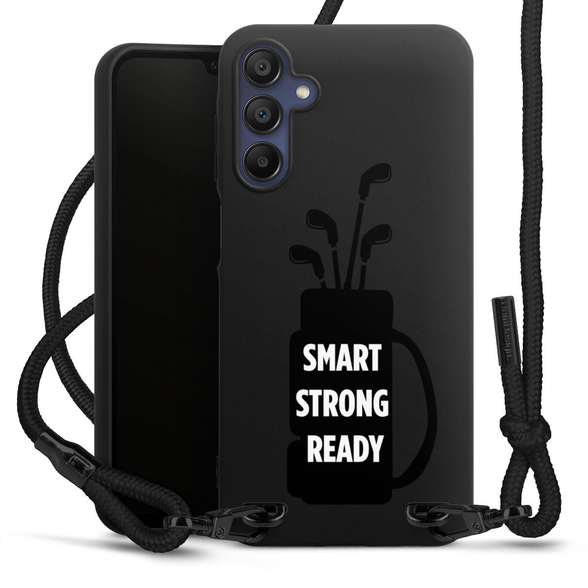 The matt black silicone case is made of flexible TPU (thermoplastic polyurethane) and offers robust protection. The durable, unbreakable material makes the cover flexible and dimensionally stable at the same time. The matte surface makes your design stand out more and is less susceptible to fingerprints and dirt. The stylish trend accessory fits comfortably in the hand and is perfectly complemented by the fabric (polyester) mobile phone strap. The braided fabric strap is approx. 1.70 metres long with a diameter of approx. 0.5 cm. Due to the special knotting technique, the length of the strap can be adjusted by simply pulling it, so that you can adapt it individually to your wishes. The practical case to wear around your neck is available with the fabric strap in black. As a little icing on the cake, we have provided the strap with a chic metal fastener in matt black. The strap is securely fastened to the case with loops made of high-quality genuine leather and press studs. The ends of the fabric strap are covered with metallic end caps and thus protected from fraying.
