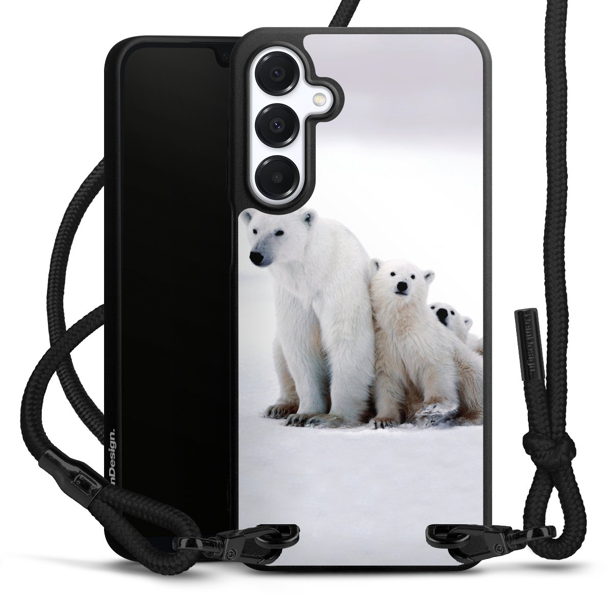The matt black silicone case is made of flexible TPU (thermoplastic polyurethane) and offers robust protection. The durable, unbreakable material makes the cover flexible and dimensionally stable at the same time. The matte surface makes your design stand out more and is less susceptible to fingerprints and dirt. The stylish trend accessory fits comfortably in the hand and is perfectly complemented by the fabric (polyester) mobile phone strap. The braided fabric strap is approx. 1.70 metres long with a diameter of approx. 0.5 cm. Due to the special knotting technique, the length of the strap can be adjusted by simply pulling it, so that you can adapt it individually to your wishes. The practical case to wear around your neck is available with the fabric strap in black. As a little icing on the cake, we have provided the strap with a chic metal fastener in matt black. The strap is securely fastened to the case with loops made of high-quality genuine leather and press studs. The ends of the fabric strap are covered with metallic end caps and thus protected from fraying.