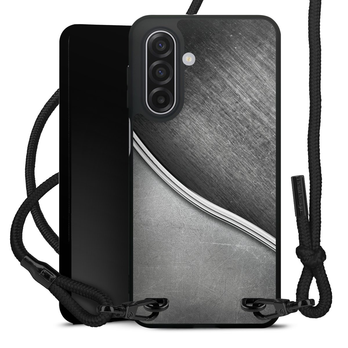 Pure Black: Phone case, fabric strap and metal details in stylish matt black.