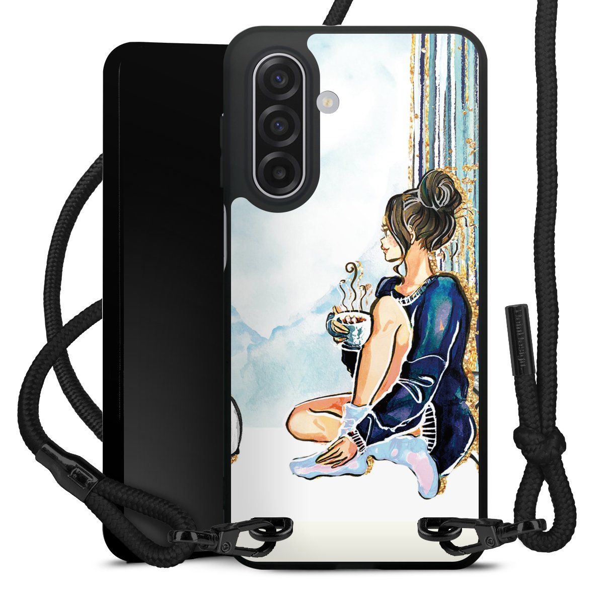 The matt black silicone case is made of flexible TPU (thermoplastic polyurethane) and offers robust protection. The durable, unbreakable material makes the cover flexible and dimensionally stable at the same time. The matte surface makes your design stand out more and is less susceptible to fingerprints and dirt. The stylish trend accessory fits comfortably in the hand and is perfectly complemented by the fabric (polyester) mobile phone strap. The braided fabric strap is approx. 1.70 metres long with a diameter of approx. 0.5 cm. Due to the special knotting technique, the length of the strap can be adjusted by simply pulling it, so that you can adapt it individually to your wishes. The practical case to wear around your neck is available with the fabric strap in black. As a little icing on the cake, we have provided the strap with a chic metal fastener in matt black. The strap is securely fastened to the case with loops made of high-quality genuine leather and press studs. The ends of the fabric strap are covered with metallic end caps and thus protected from fraying.