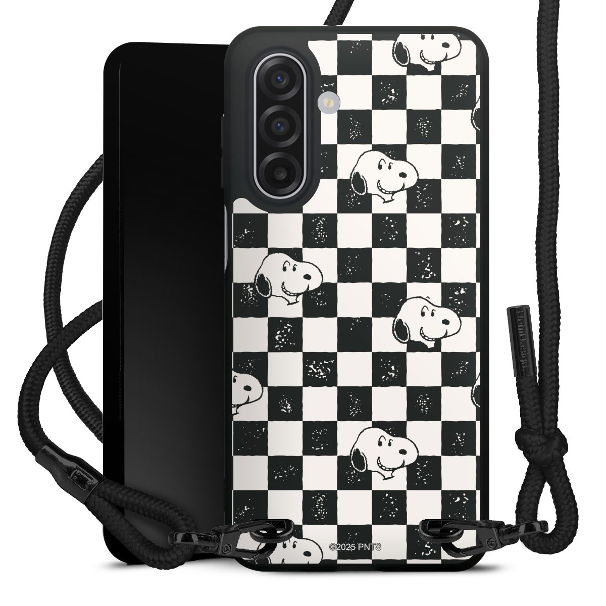 The matt black silicone case is made of flexible TPU (thermoplastic polyurethane) and offers robust protection. The durable, unbreakable material makes the cover flexible and dimensionally stable at the same time. The matte surface makes your design stand out more and is less susceptible to fingerprints and dirt. The stylish trend accessory fits comfortably in the hand and is perfectly complemented by the fabric (polyester) mobile phone strap. The braided fabric strap is approx. 1.70 metres long with a diameter of approx. 0.5 cm. Due to the special knotting technique, the length of the strap can be adjusted by simply pulling it, so that you can adapt it individually to your wishes. The practical case to wear around your neck is available with the fabric strap in black. As a little icing on the cake, we have provided the strap with a chic metal fastener in matt black. The strap is securely fastened to the case with loops made of high-quality genuine leather and press studs. The ends of the fabric strap are covered with metallic end caps and thus protected from fraying.