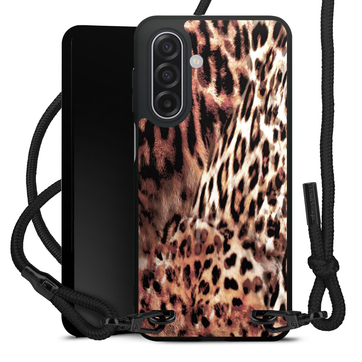 The matt black silicone case is made of flexible TPU (thermoplastic polyurethane) and offers robust protection. The durable, unbreakable material makes the cover flexible and dimensionally stable at the same time. The matte surface makes your design stand out more and is less susceptible to fingerprints and dirt. The stylish trend accessory fits comfortably in the hand and is perfectly complemented by the fabric (polyester) mobile phone strap. The braided fabric strap is approx. 1.70 metres long with a diameter of approx. 0.5 cm. Due to the special knotting technique, the length of the strap can be adjusted by simply pulling it, so that you can adapt it individually to your wishes. The practical case to wear around your neck is available with the fabric strap in black. As a little icing on the cake, we have provided the strap with a chic metal fastener in matt black. The strap is securely fastened to the case with loops made of high-quality genuine leather and press studs. The ends of the fabric strap are covered with metallic end caps and thus protected from fraying.