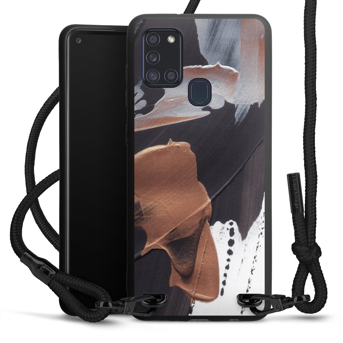 The matt black silicone case is made of flexible TPU (thermoplastic polyurethane) and offers robust protection. The durable, unbreakable material makes the cover flexible and dimensionally stable at the same time. The matte surface makes your design stand out more and is less susceptible to fingerprints and dirt. The stylish trend accessory fits comfortably in the hand and is perfectly complemented by the fabric (polyester) mobile phone strap. The braided fabric strap is approx. 1.70 metres long with a diameter of approx. 0.5 cm. Due to the special knotting technique, the length of the strap can be adjusted by simply pulling it, so that you can adapt it individually to your wishes. The practical case to wear around your neck is available with the fabric strap in black. As a little icing on the cake, we have provided the strap with a chic metal fastener in matt black. The strap is securely fastened to the case with loops made of high-quality genuine leather and press studs. The ends of the fabric strap are covered with metallic end caps and thus protected from fraying.