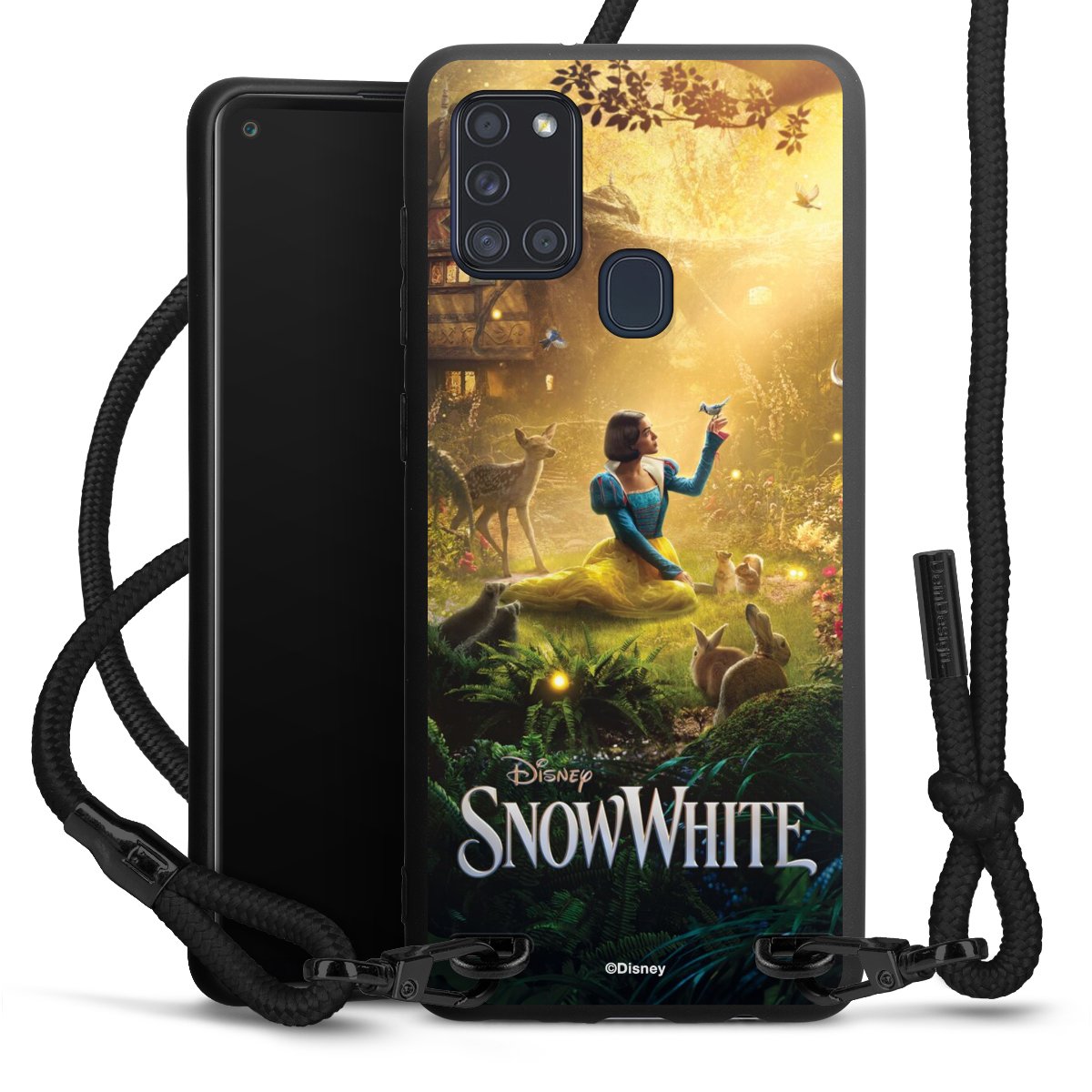 The matt black silicone case is made of flexible TPU (thermoplastic polyurethane) and offers robust protection. The durable, unbreakable material makes the cover flexible and dimensionally stable at the same time. The matte surface makes your design stand out more and is less susceptible to fingerprints and dirt. The stylish trend accessory fits comfortably in the hand and is perfectly complemented by the fabric (polyester) mobile phone strap. The braided fabric strap is approx. 1.70 metres long with a diameter of approx. 0.5 cm. Due to the special knotting technique, the length of the strap can be adjusted by simply pulling it, so that you can adapt it individually to your wishes. The practical case to wear around your neck is available with the fabric strap in black. As a little icing on the cake, we have provided the strap with a chic metal fastener in matt black. The strap is securely fastened to the case with loops made of high-quality genuine leather and press studs. The ends of the fabric strap are covered with metallic end caps and thus protected from fraying.