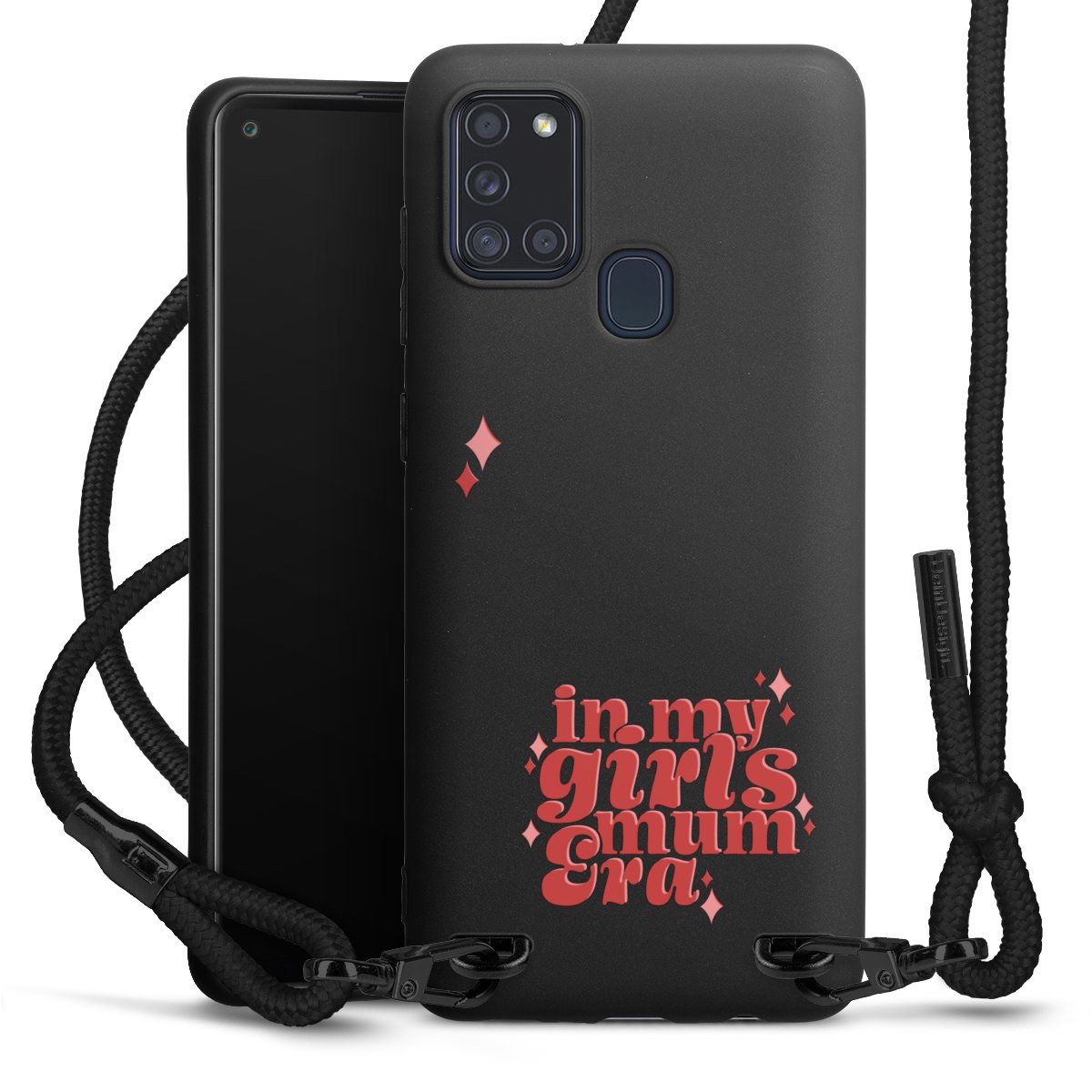 The matt black silicone case is made of flexible TPU (thermoplastic polyurethane) and offers robust protection. The durable, unbreakable material makes the cover flexible and dimensionally stable at the same time. The matte surface makes your design stand out more and is less susceptible to fingerprints and dirt. The stylish trend accessory fits comfortably in the hand and is perfectly complemented by the fabric (polyester) mobile phone strap. The braided fabric strap is approx. 1.70 metres long with a diameter of approx. 0.5 cm. Due to the special knotting technique, the length of the strap can be adjusted by simply pulling it, so that you can adapt it individually to your wishes. The practical case to wear around your neck is available with the fabric strap in black. As a little icing on the cake, we have provided the strap with a chic metal fastener in matt black. The strap is securely fastened to the case with loops made of high-quality genuine leather and press studs. The ends of the fabric strap are covered with metallic end caps and thus protected from fraying.