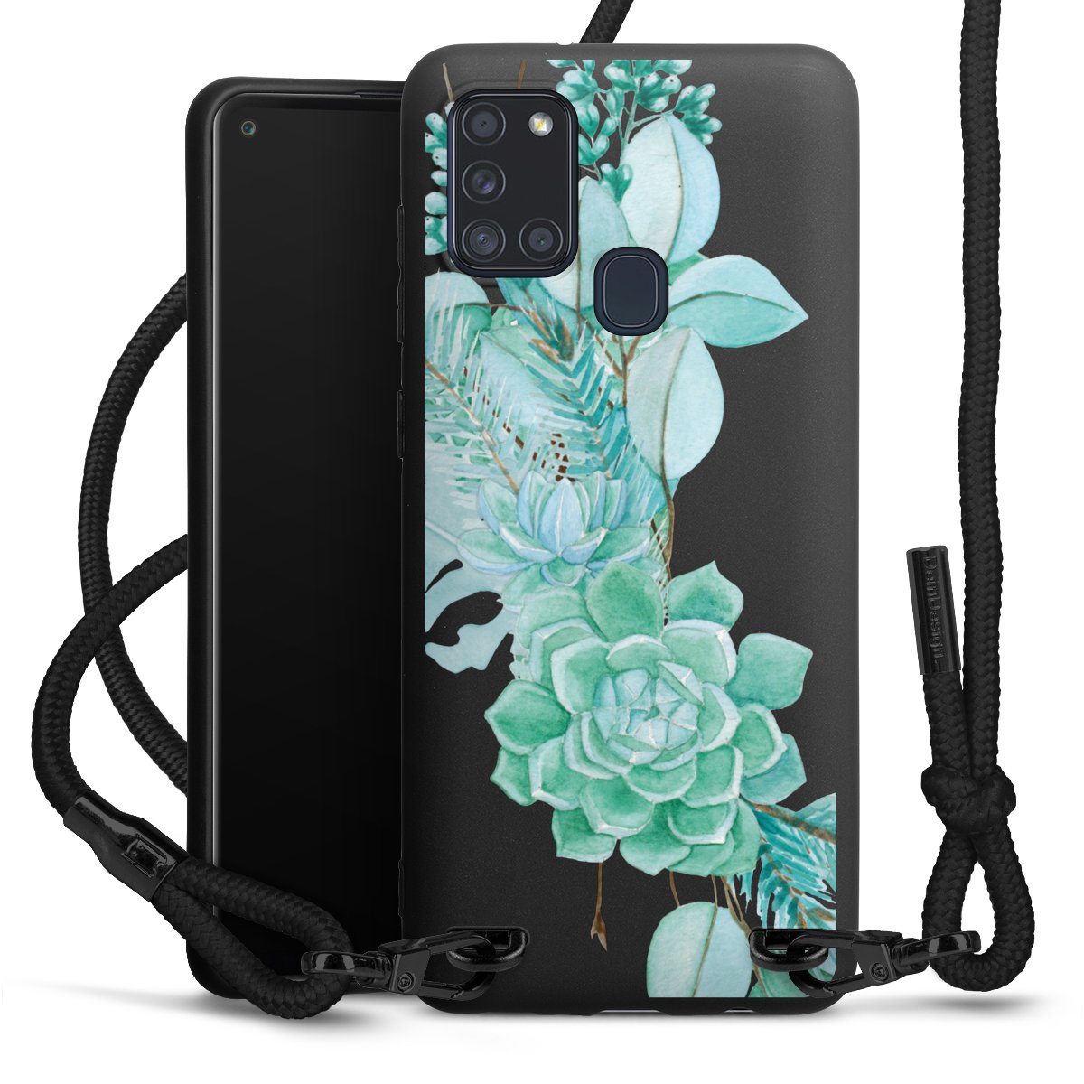 The matt black silicone case is made of flexible TPU (thermoplastic polyurethane) and offers robust protection. The durable, unbreakable material makes the cover flexible and dimensionally stable at the same time. The matte surface makes your design stand out more and is less susceptible to fingerprints and dirt. The stylish trend accessory fits comfortably in the hand and is perfectly complemented by the fabric (polyester) mobile phone strap. The braided fabric strap is approx. 1.70 metres long with a diameter of approx. 0.5 cm. Due to the special knotting technique, the length of the strap can be adjusted by simply pulling it, so that you can adapt it individually to your wishes. The practical case to wear around your neck is available with the fabric strap in black. As a little icing on the cake, we have provided the strap with a chic metal fastener in matt black. The strap is securely fastened to the case with loops made of high-quality genuine leather and press studs. The ends of the fabric strap are covered with metallic end caps and thus protected from fraying.