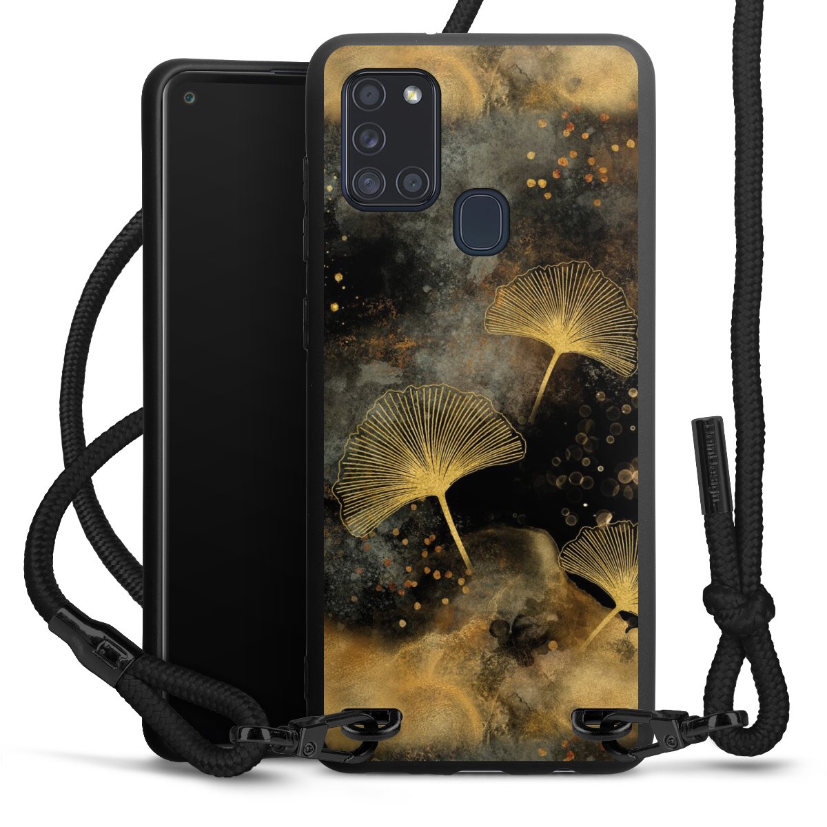 The matt black silicone case is made of flexible TPU (thermoplastic polyurethane) and offers robust protection. The durable, unbreakable material makes the cover flexible and dimensionally stable at the same time. The matte surface makes your design stand out more and is less susceptible to fingerprints and dirt. The stylish trend accessory fits comfortably in the hand and is perfectly complemented by the fabric (polyester) mobile phone strap. The braided fabric strap is approx. 1.70 metres long with a diameter of approx. 0.5 cm. Due to the special knotting technique, the length of the strap can be adjusted by simply pulling it, so that you can adapt it individually to your wishes. The practical case to wear around your neck is available with the fabric strap in black. As a little icing on the cake, we have provided the strap with a chic metal fastener in matt black. The strap is securely fastened to the case with loops made of high-quality genuine leather and press studs. The ends of the fabric strap are covered with metallic end caps and thus protected from fraying.