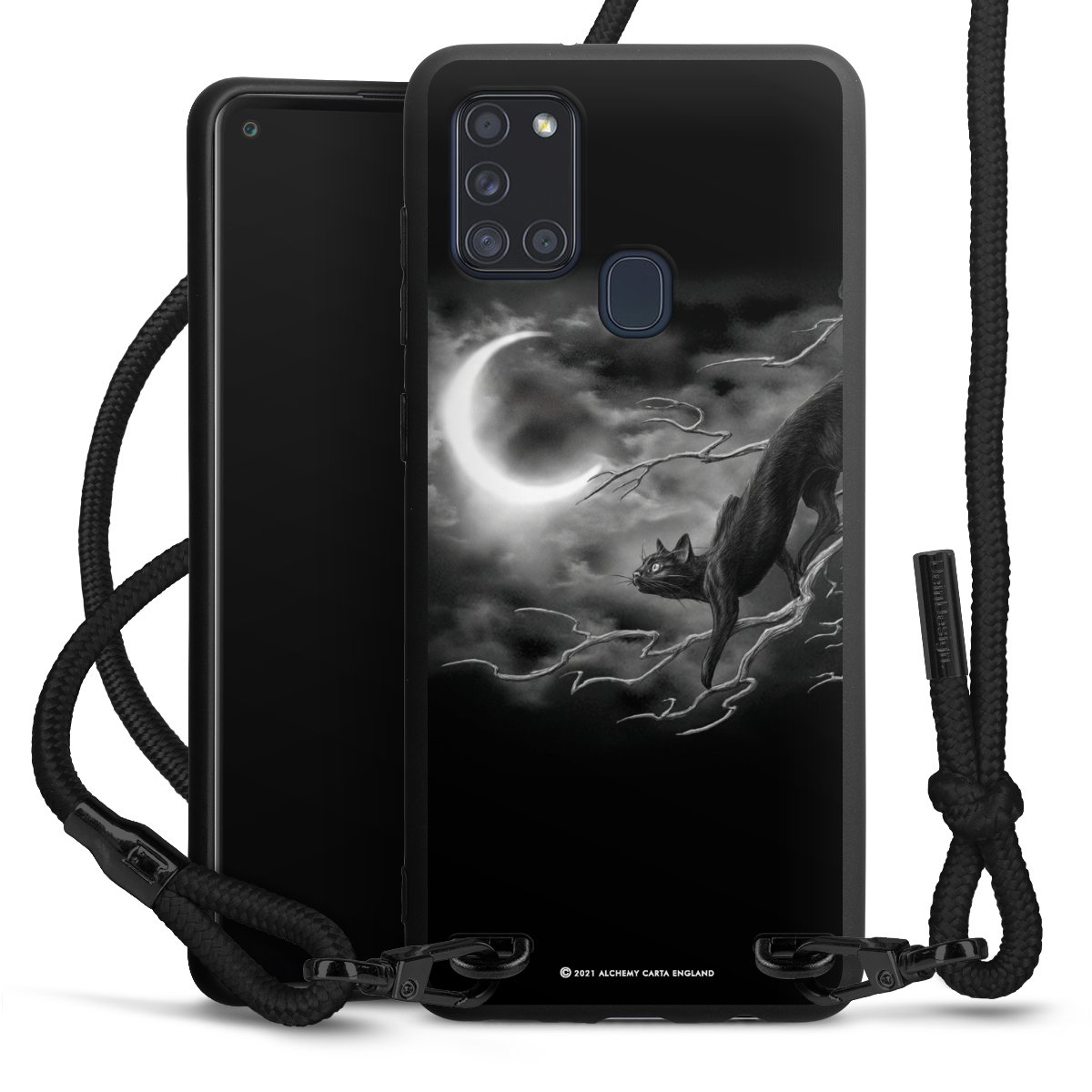 The matt black silicone case is made of flexible TPU (thermoplastic polyurethane) and offers robust protection. The durable, unbreakable material makes the cover flexible and dimensionally stable at the same time. The matte surface makes your design stand out more and is less susceptible to fingerprints and dirt. The stylish trend accessory fits comfortably in the hand and is perfectly complemented by the fabric (polyester) mobile phone strap. The braided fabric strap is approx. 1.70 metres long with a diameter of approx. 0.5 cm. Due to the special knotting technique, the length of the strap can be adjusted by simply pulling it, so that you can adapt it individually to your wishes. The practical case to wear around your neck is available with the fabric strap in black. As a little icing on the cake, we have provided the strap with a chic metal fastener in matt black. The strap is securely fastened to the case with loops made of high-quality genuine leather and press studs. The ends of the fabric strap are covered with metallic end caps and thus protected from fraying.