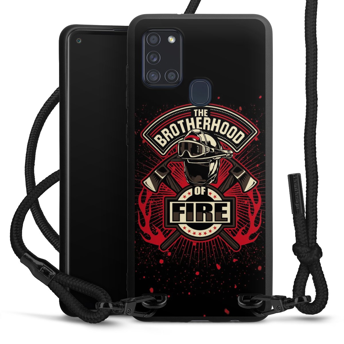 The matt black silicone case is made of flexible TPU (thermoplastic polyurethane) and offers robust protection. The durable, unbreakable material makes the cover flexible and dimensionally stable at the same time. The matte surface makes your design stand out more and is less susceptible to fingerprints and dirt. The stylish trend accessory fits comfortably in the hand and is perfectly complemented by the fabric (polyester) mobile phone strap. The braided fabric strap is approx. 1.70 metres long with a diameter of approx. 0.5 cm. Due to the special knotting technique, the length of the strap can be adjusted by simply pulling it, so that you can adapt it individually to your wishes. The practical case to wear around your neck is available with the fabric strap in black. As a little icing on the cake, we have provided the strap with a chic metal fastener in matt black. The strap is securely fastened to the case with loops made of high-quality genuine leather and press studs. The ends of the fabric strap are covered with metallic end caps and thus protected from fraying.