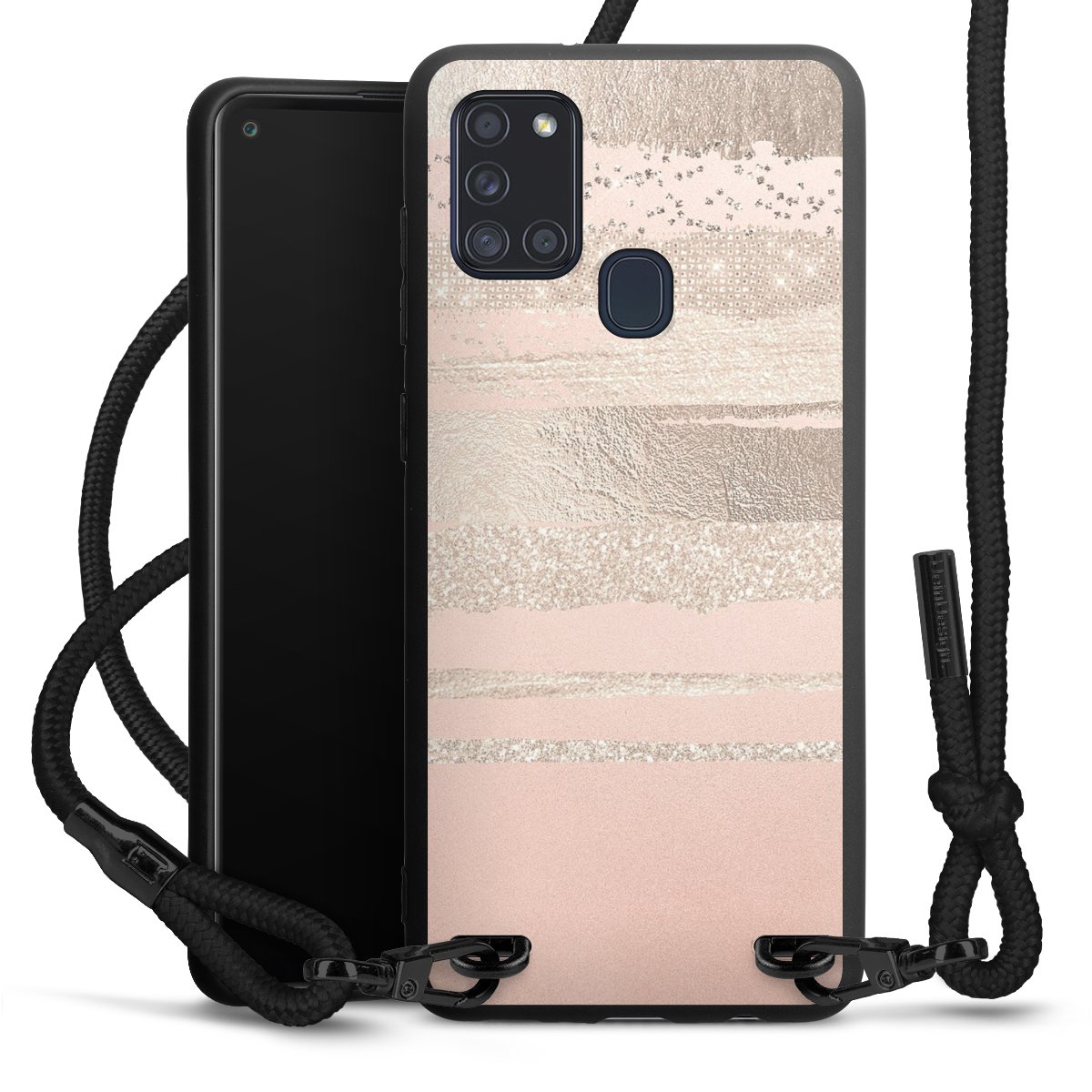 The matt black silicone case is made of flexible TPU (thermoplastic polyurethane) and offers robust protection. The durable, unbreakable material makes the cover flexible and dimensionally stable at the same time. The matte surface makes your design stand out more and is less susceptible to fingerprints and dirt. The stylish trend accessory fits comfortably in the hand and is perfectly complemented by the fabric (polyester) mobile phone strap. The braided fabric strap is approx. 1.70 metres long with a diameter of approx. 0.5 cm. Due to the special knotting technique, the length of the strap can be adjusted by simply pulling it, so that you can adapt it individually to your wishes. The practical case to wear around your neck is available with the fabric strap in black. As a little icing on the cake, we have provided the strap with a chic metal fastener in matt black. The strap is securely fastened to the case with loops made of high-quality genuine leather and press studs. The ends of the fabric strap are covered with metallic end caps and thus protected from fraying.