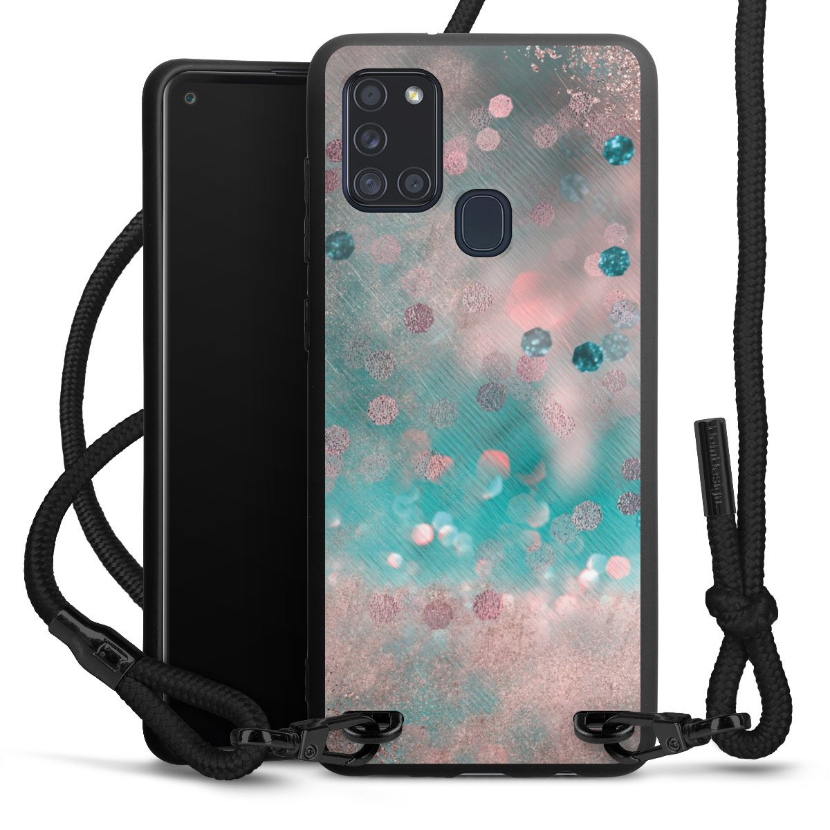 The matt black silicone case is made of flexible TPU (thermoplastic polyurethane) and offers robust protection. The durable, unbreakable material makes the cover flexible and dimensionally stable at the same time. The matte surface makes your design stand out more and is less susceptible to fingerprints and dirt. The stylish trend accessory fits comfortably in the hand and is perfectly complemented by the fabric (polyester) mobile phone strap. The braided fabric strap is approx. 1.70 metres long with a diameter of approx. 0.5 cm. Due to the special knotting technique, the length of the strap can be adjusted by simply pulling it, so that you can adapt it individually to your wishes. The practical case to wear around your neck is available with the fabric strap in black. As a little icing on the cake, we have provided the strap with a chic metal fastener in matt black. The strap is securely fastened to the case with loops made of high-quality genuine leather and press studs. The ends of the fabric strap are covered with metallic end caps and thus protected from fraying.