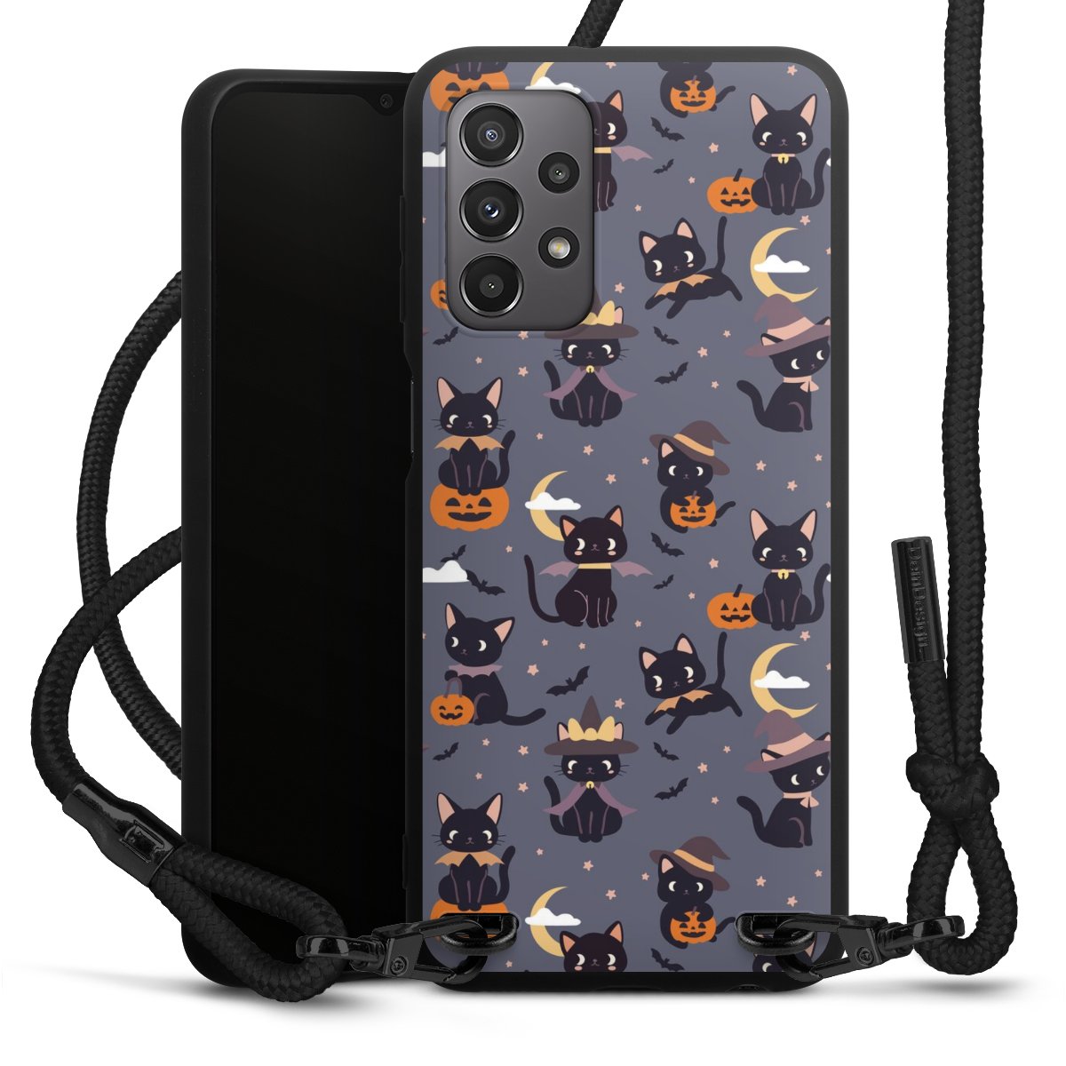 The matt black silicone case is made of flexible TPU (thermoplastic polyurethane) and offers robust protection. The durable, unbreakable material makes the cover flexible and dimensionally stable at the same time. The matte surface makes your design stand out more and is less susceptible to fingerprints and dirt. The stylish trend accessory fits comfortably in the hand and is perfectly complemented by the fabric (polyester) mobile phone strap. The braided fabric strap is approx. 1.70 metres long with a diameter of approx. 0.5 cm. Due to the special knotting technique, the length of the strap can be adjusted by simply pulling it, so that you can adapt it individually to your wishes. The practical case to wear around your neck is available with the fabric strap in black. As a little icing on the cake, we have provided the strap with a chic metal fastener in matt black. The strap is securely fastened to the case with loops made of high-quality genuine leather and press studs. The ends of the fabric strap are covered with metallic end caps and thus protected from fraying.