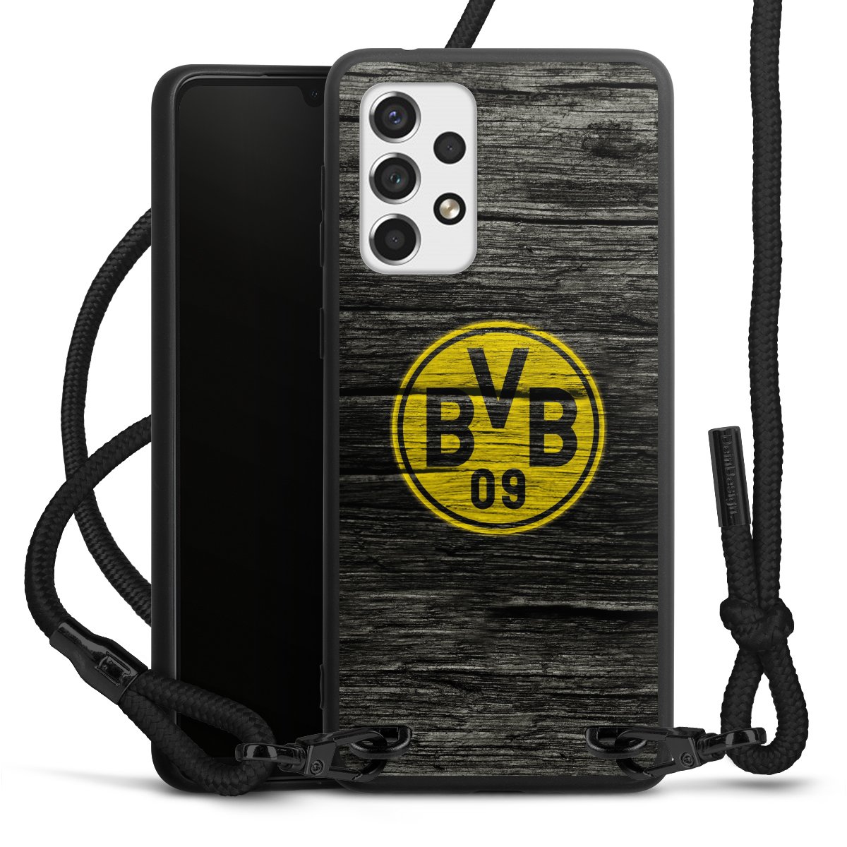 The matt black silicone case is made of flexible TPU (thermoplastic polyurethane) and offers robust protection. The durable, unbreakable material makes the cover flexible and dimensionally stable at the same time. The matte surface makes your design stand out more and is less susceptible to fingerprints and dirt. The stylish trend accessory fits comfortably in the hand and is perfectly complemented by the fabric (polyester) mobile phone strap. The braided fabric strap is approx. 1.70 metres long with a diameter of approx. 0.5 cm. Due to the special knotting technique, the length of the strap can be adjusted by simply pulling it, so that you can adapt it individually to your wishes. The practical case to wear around your neck is available with the fabric strap in black. As a little icing on the cake, we have provided the strap with a chic metal fastener in matt black. The strap is securely fastened to the case with loops made of high-quality genuine leather and press studs. The ends of the fabric strap are covered with metallic end caps and thus protected from fraying.