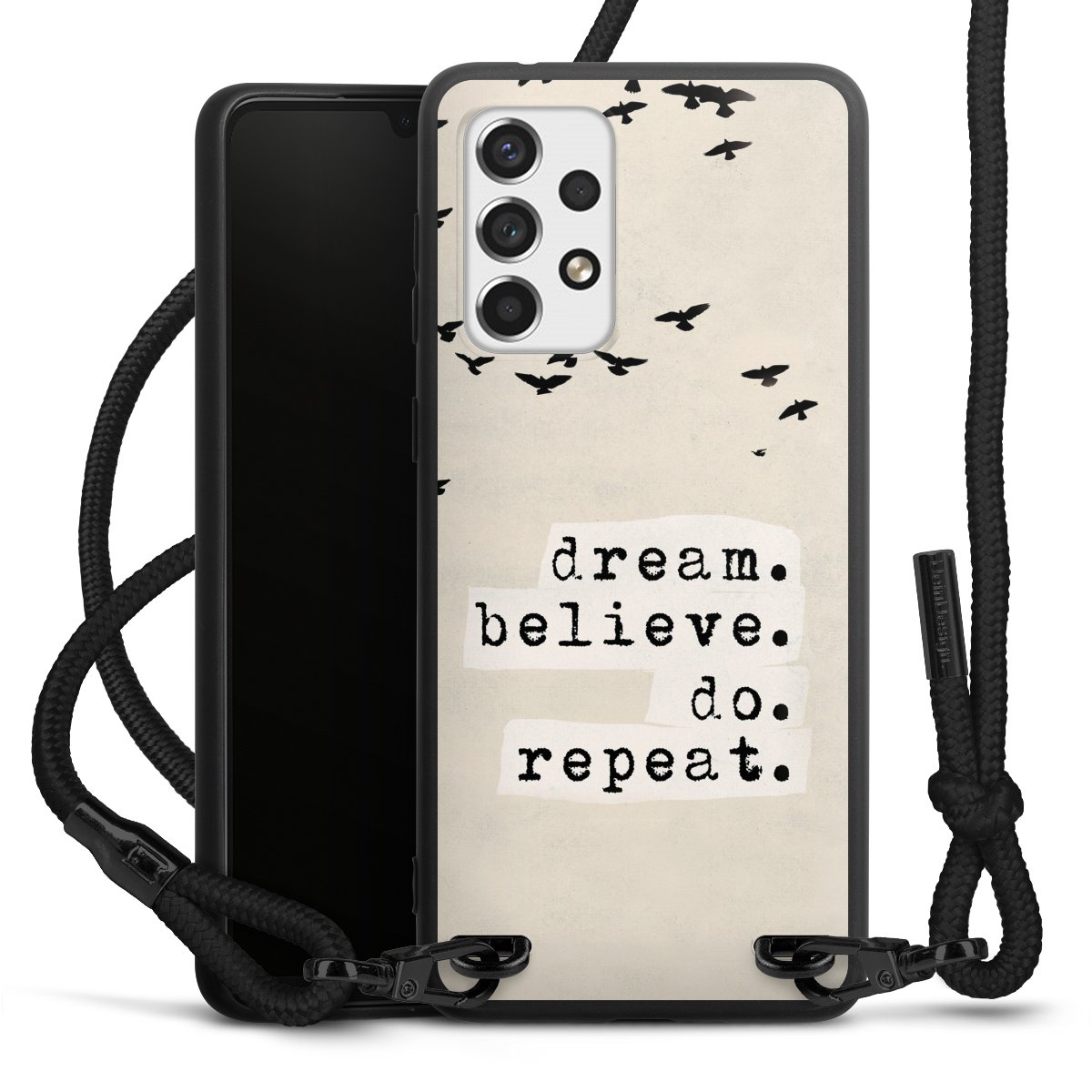 We use the solid direct print process for this phone case, which is why the print area only covers the back and the edge remains unprinted. The case to wear around your neck can be ordered unprinted, fully printed, or partially printed. For your design, either choose one of our exclusive shop motifs or get creative and create your own design, for example with photos and overlays. Design your own personal trend accessory and make an individual statement on the streets!