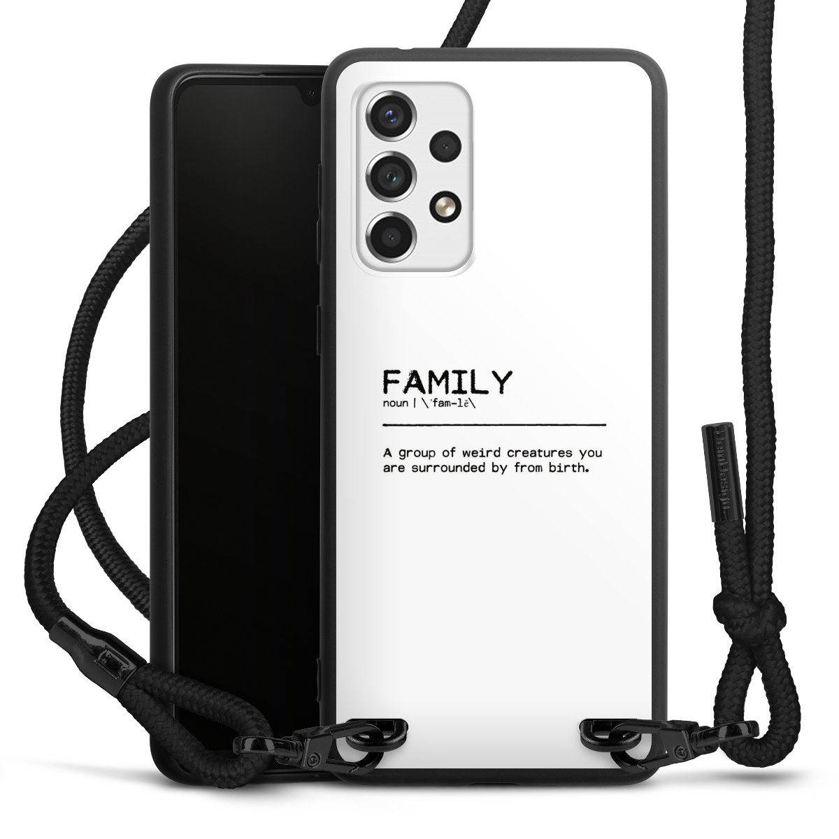 The matt black silicone case is made of flexible TPU (thermoplastic polyurethane) and offers robust protection. The durable, unbreakable material makes the cover flexible and dimensionally stable at the same time. The matte surface makes your design stand out more and is less susceptible to fingerprints and dirt. The stylish trend accessory fits comfortably in the hand and is perfectly complemented by the fabric (polyester) mobile phone strap. The braided fabric strap is approx. 1.70 metres long with a diameter of approx. 0.5 cm. Due to the special knotting technique, the length of the strap can be adjusted by simply pulling it, so that you can adapt it individually to your wishes. The practical case to wear around your neck is available with the fabric strap in black. As a little icing on the cake, we have provided the strap with a chic metal fastener in matt black. The strap is securely fastened to the case with loops made of high-quality genuine leather and press studs. The ends of the fabric strap are covered with metallic end caps and thus protected from fraying.