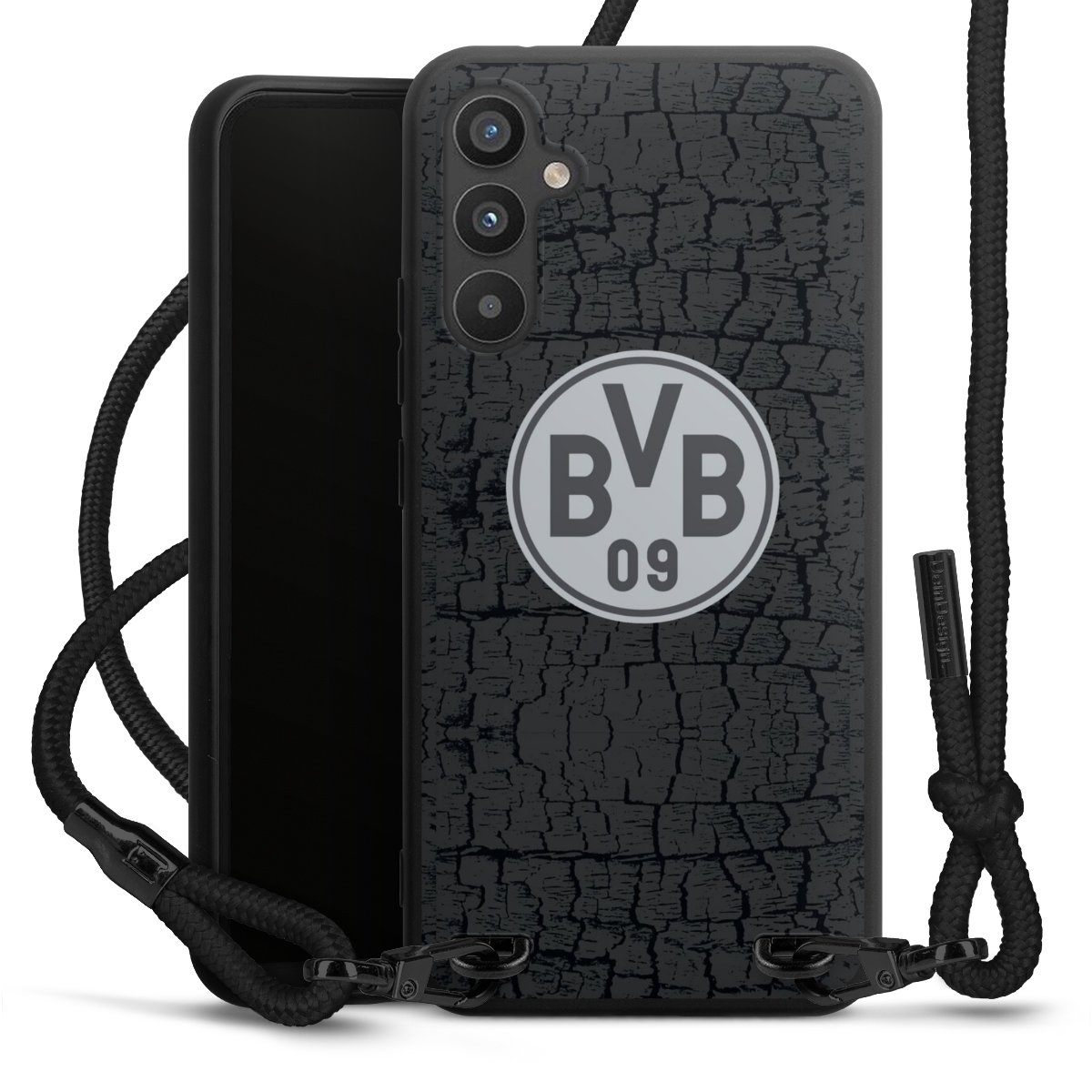 The matt black silicone case is made of flexible TPU (thermoplastic polyurethane) and offers robust protection. The durable, unbreakable material makes the cover flexible and dimensionally stable at the same time. The matte surface makes your design stand out more and is less susceptible to fingerprints and dirt. The stylish trend accessory fits comfortably in the hand and is perfectly complemented by the fabric (polyester) mobile phone strap. The braided fabric strap is approx. 1.70 metres long with a diameter of approx. 0.5 cm. Due to the special knotting technique, the length of the strap can be adjusted by simply pulling it, so that you can adapt it individually to your wishes. The practical case to wear around your neck is available with the fabric strap in black. As a little icing on the cake, we have provided the strap with a chic metal fastener in matt black. The strap is securely fastened to the case with loops made of high-quality genuine leather and press studs. The ends of the fabric strap are covered with metallic end caps and thus protected from fraying.