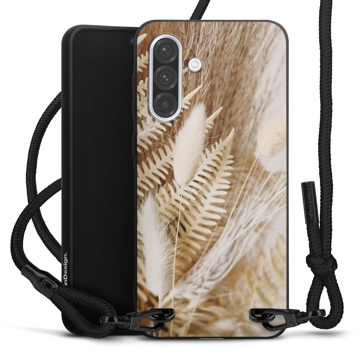 The matt black silicone case is made of flexible TPU (thermoplastic polyurethane) and offers robust protection. The durable, unbreakable material makes the cover flexible and dimensionally stable at the same time. The matte surface makes your design stand out more and is less susceptible to fingerprints and dirt. The stylish trend accessory fits comfortably in the hand and is perfectly complemented by the fabric (polyester) mobile phone strap. The braided fabric strap is approx. 1.70 metres long with a diameter of approx. 0.5 cm. Due to the special knotting technique, the length of the strap can be adjusted by simply pulling it, so that you can adapt it individually to your wishes. The practical case to wear around your neck is available with the fabric strap in black. As a little icing on the cake, we have provided the strap with a chic metal fastener in matt black. The strap is securely fastened to the case with loops made of high-quality genuine leather and press studs. The ends of the fabric strap are covered with metallic end caps and thus protected from fraying.