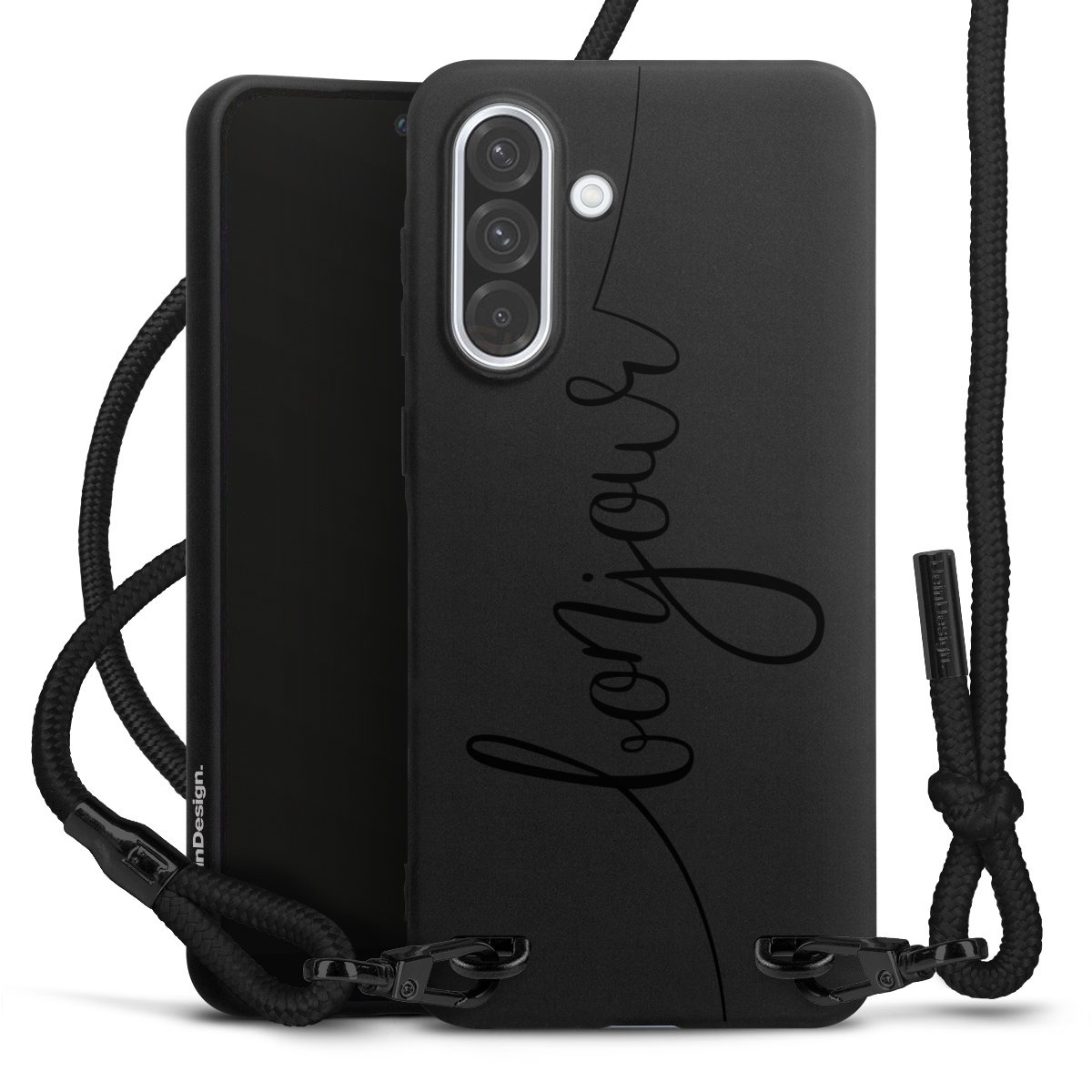 The matt black silicone case is made of flexible TPU (thermoplastic polyurethane) and offers robust protection. The durable, unbreakable material makes the cover flexible and dimensionally stable at the same time. The matte surface makes your design stand out more and is less susceptible to fingerprints and dirt. The stylish trend accessory fits comfortably in the hand and is perfectly complemented by the fabric (polyester) mobile phone strap. The braided fabric strap is approx. 1.70 metres long with a diameter of approx. 0.5 cm. Due to the special knotting technique, the length of the strap can be adjusted by simply pulling it, so that you can adapt it individually to your wishes. The practical case to wear around your neck is available with the fabric strap in black. As a little icing on the cake, we have provided the strap with a chic metal fastener in matt black. The strap is securely fastened to the case with loops made of high-quality genuine leather and press studs. The ends of the fabric strap are covered with metallic end caps and thus protected from fraying.