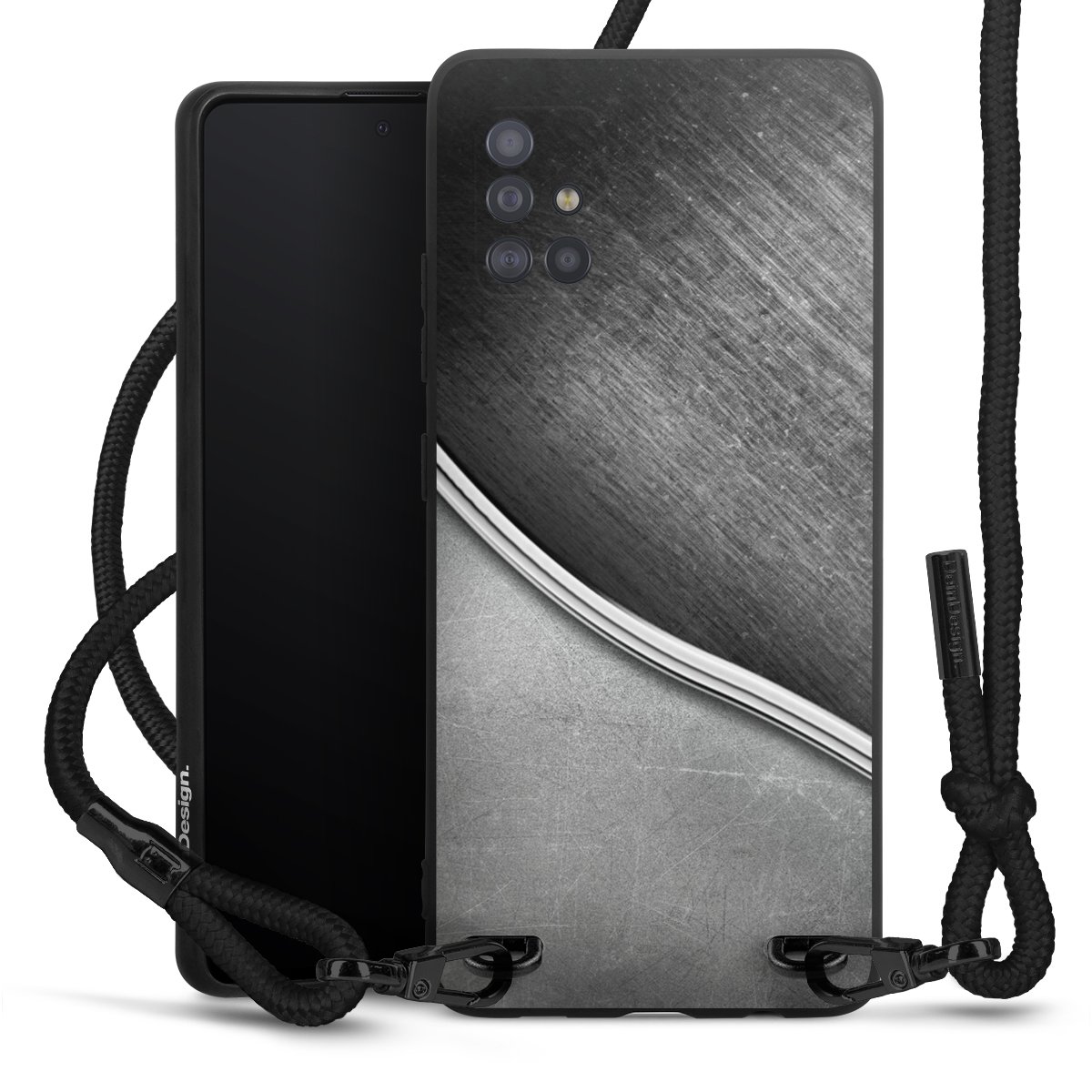 The matt black silicone case is made of flexible TPU (thermoplastic polyurethane) and offers robust protection. The durable, unbreakable material makes the cover flexible and dimensionally stable at the same time. The matte surface makes your design stand out more and is less susceptible to fingerprints and dirt. The stylish trend accessory fits comfortably in the hand and is perfectly complemented by the fabric (polyester) mobile phone strap. The braided fabric strap is approx. 1.70 metres long with a diameter of approx. 0.5 cm. Due to the special knotting technique, the length of the strap can be adjusted by simply pulling it, so that you can adapt it individually to your wishes. The practical case to wear around your neck is available with the fabric strap in black. As a little icing on the cake, we have provided the strap with a chic metal fastener in matt black. The strap is securely fastened to the case with loops made of high-quality genuine leather and press studs. The ends of the fabric strap are covered with metallic end caps and thus protected from fraying.