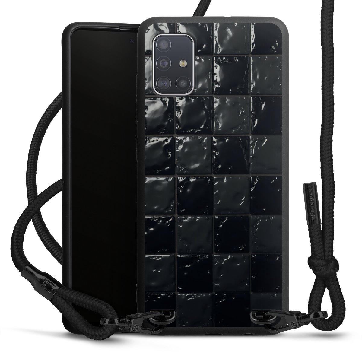 The matt black silicone case is made of flexible TPU (thermoplastic polyurethane) and offers robust protection. The durable, unbreakable material makes the cover flexible and dimensionally stable at the same time. The matte surface makes your design stand out more and is less susceptible to fingerprints and dirt. The stylish trend accessory fits comfortably in the hand and is perfectly complemented by the fabric (polyester) mobile phone strap. The braided fabric strap is approx. 1.70 metres long with a diameter of approx. 0.5 cm. Due to the special knotting technique, the length of the strap can be adjusted by simply pulling it, so that you can adapt it individually to your wishes. The practical case to wear around your neck is available with the fabric strap in black. As a little icing on the cake, we have provided the strap with a chic metal fastener in matt black. The strap is securely fastened to the case with loops made of high-quality genuine leather and press studs. The ends of the fabric strap are covered with metallic end caps and thus protected from fraying.